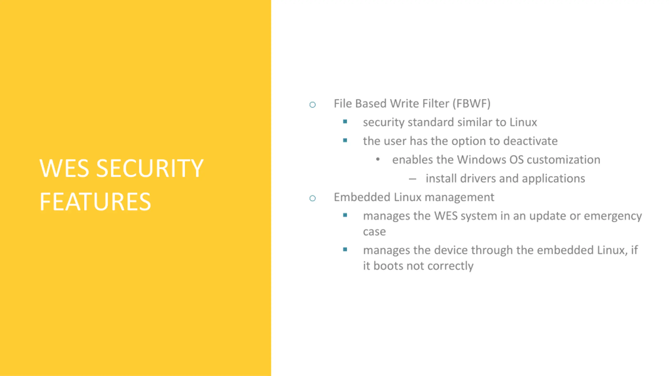 o File Based Write Filter (FBWF) security standard similar to Linux the user has the option to deactivate enables the Windows OS customization install drivers and applications Embedded Linux management manages the WES system in an update or emergency case manages the device through the embedded Linux, if it boots not correctly WES SECURITY FEATURES o