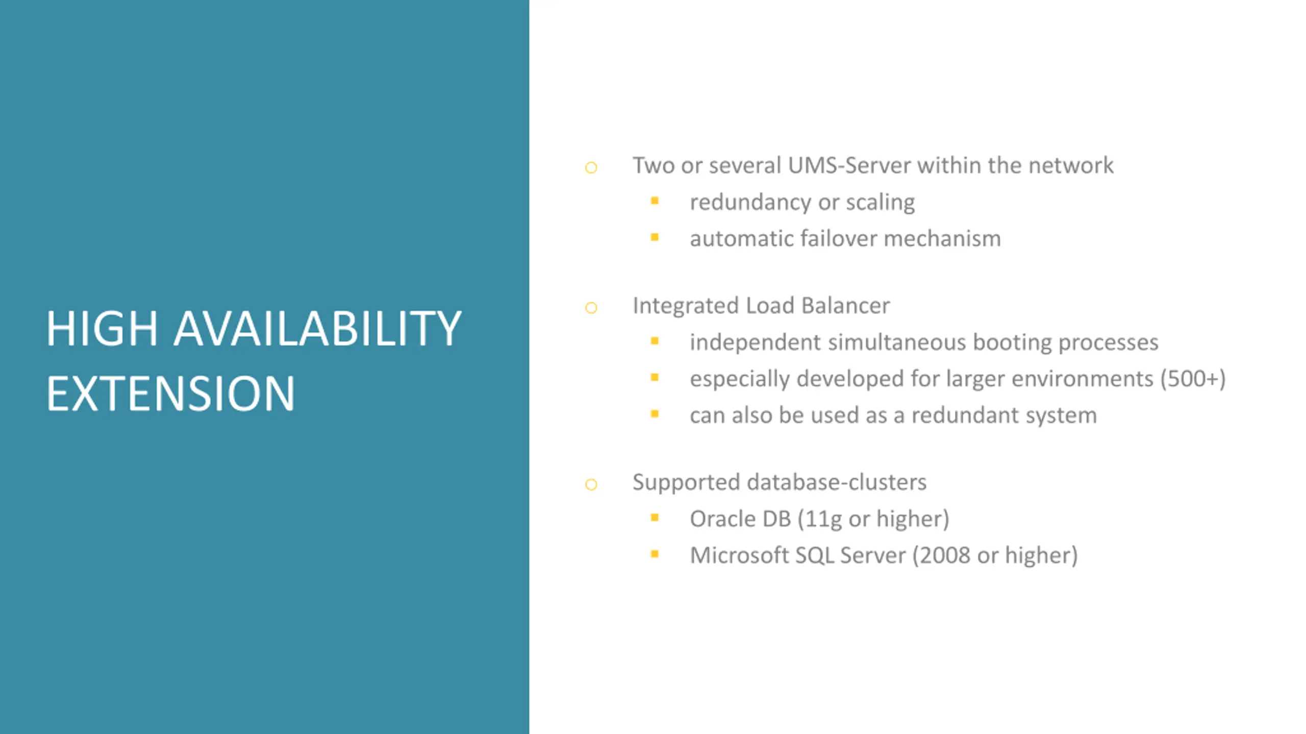 o Two or several UMS-Server within the network redundancy or scaling automatic failover mechanism o Integrated Load Balancer independent simultaneous booting processes especially developed for larger environments (500+) can also be used as a redundant system HIGH AVAILABILITY EXTENSION o Supported database-clusters Oracle DB (11g or higher) Microsoft SQL Server (2008 or higher)