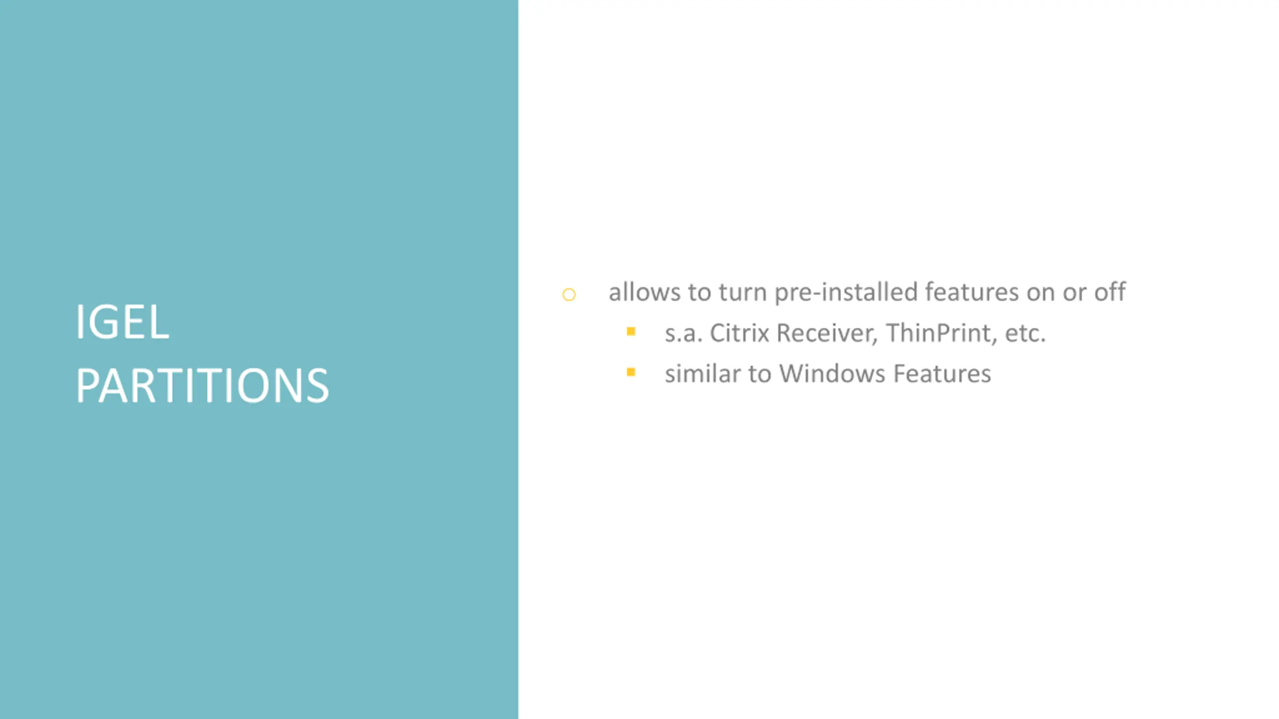o allows to turn pre-installed features on or off s.a. Citrix Receiver, ThinPrint, etc. similar to Windows Features IGEL PARTITIONS