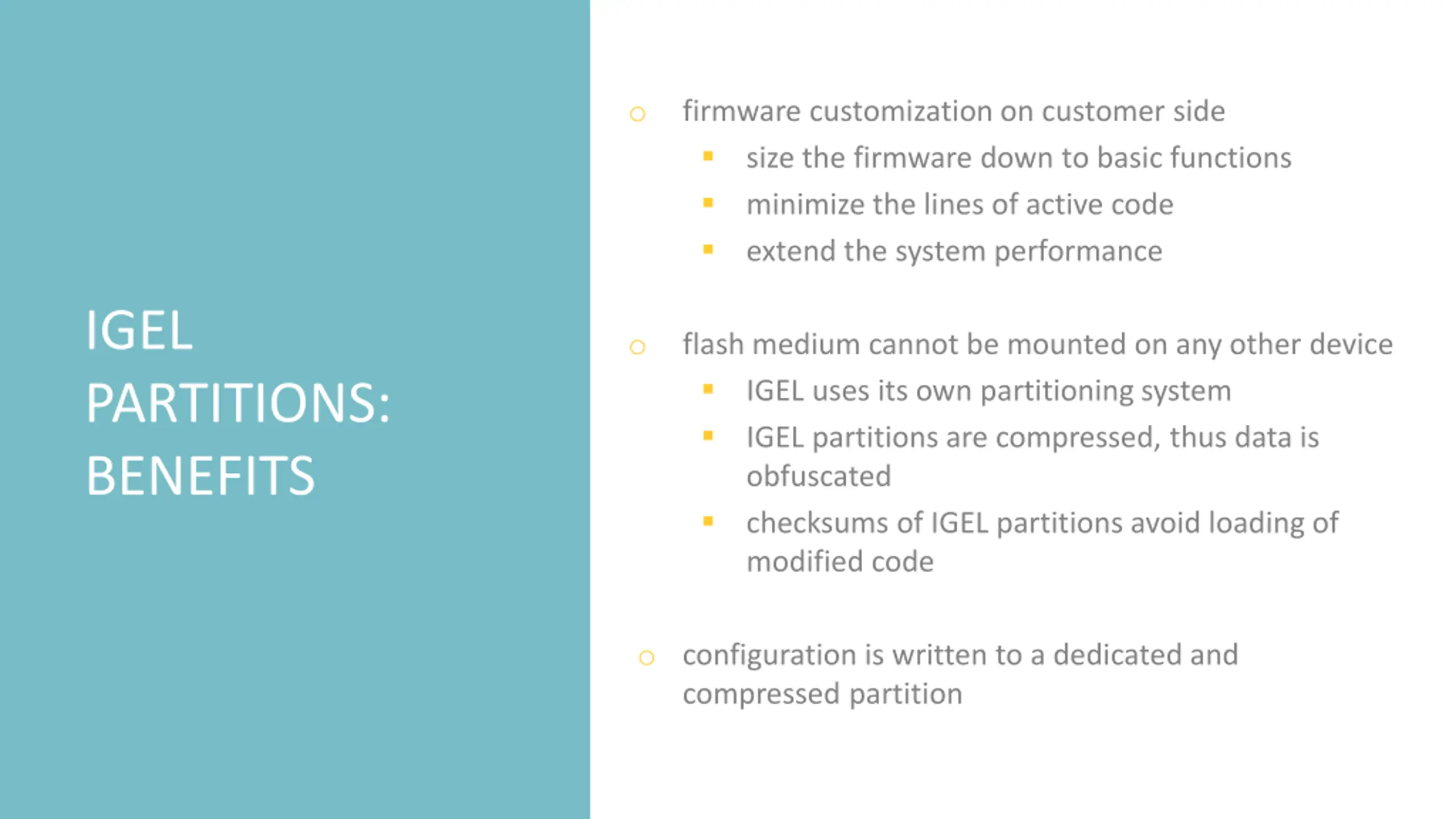 o firmware customization on customer side size the firmware down to basic functions minimize the lines of active code extend the system performance IGEL PARTITIONS: BENEFITS o flash medium cannot be mounted on any other device IGEL uses its own partitioning system IGEL partitions are compressed, thus data is obfuscated checksums of IGEL partitions avoid loading of modified code o configuration is written to a dedicated and compressed partition