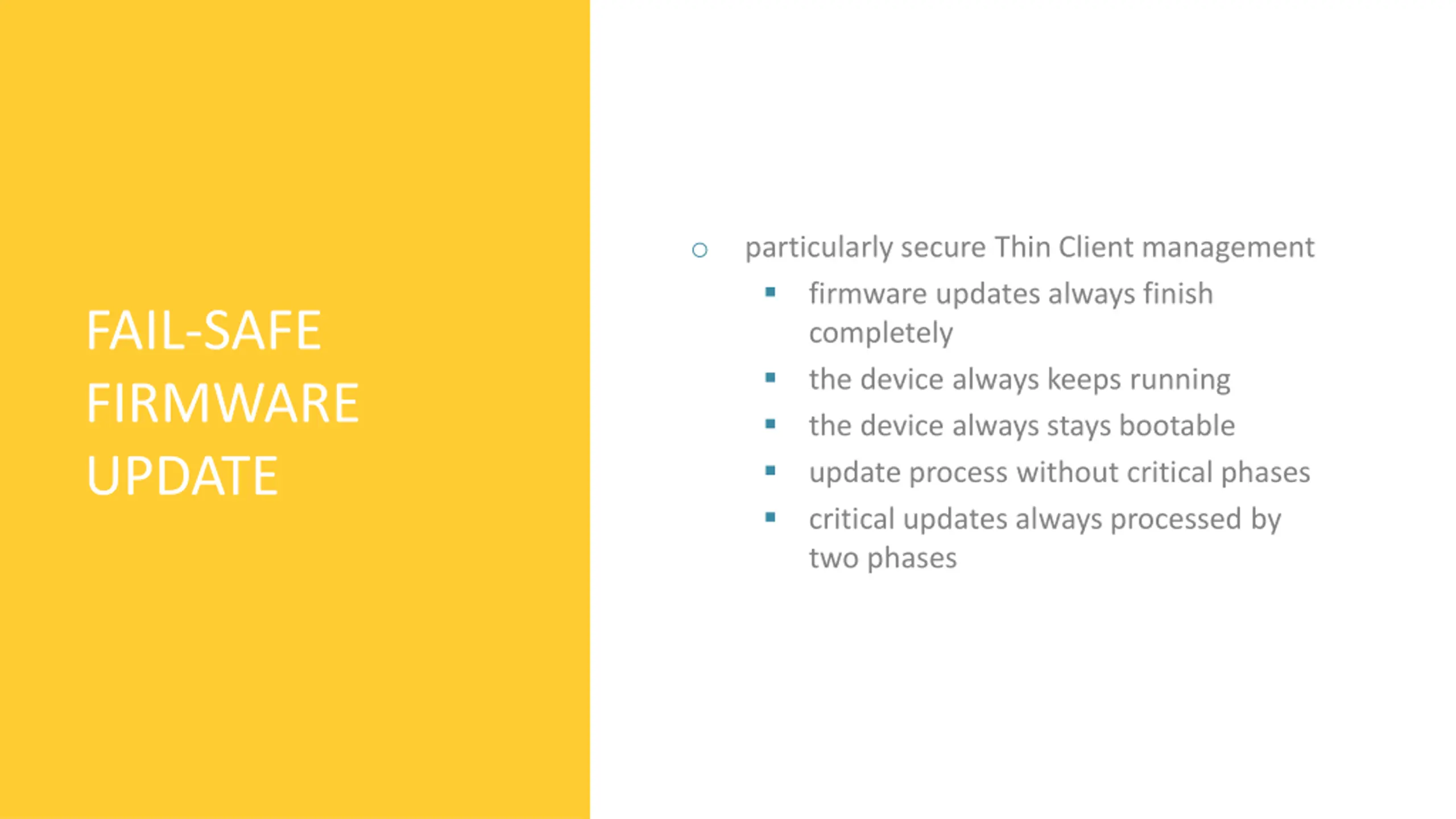 o particularly secure Thin Client management firmware updates always finish completely the device always keeps running the device always stays bootable update process without critical phases critical updates always processed by two phases FAIL-SAFE FIRMWARE UPDATE
