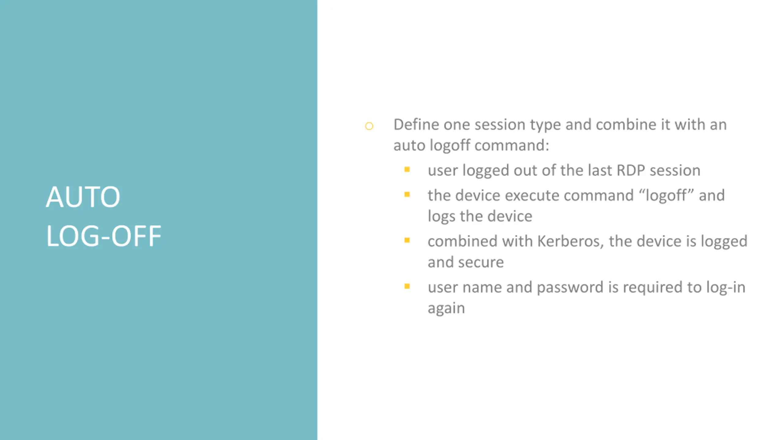 o Define one session type and combine it with an auto logoff command: user logged out of the last RDP session the device execute command logoff and logs the device combined with Kerberos, the device is logged and secure user name and password is required to log-in again AUTO LOG-OFF