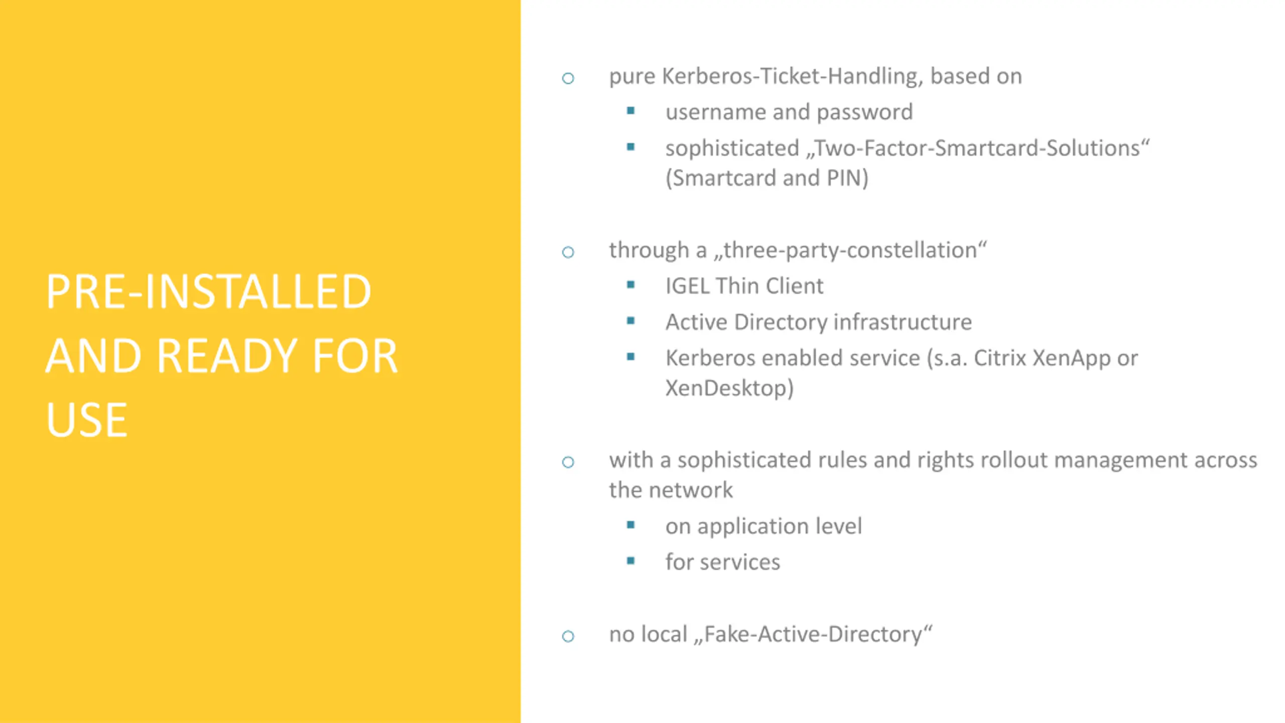o pure Kerberos-Ticket-Handling, based on username and password sophisticated Two-Factor-Smartcard-Solutions (Smartcard and PIN) o through a three-party-constellation IGEL Thin Client Active Directory infrastructure Kerberos enabled service (s.a. Citrix XenApp or XenDesktop) PRE-INSTALLED AND READY FOR USE o with a sophisticated rules and rights rollout management across the network on application level for services o no local Fake-Active-Directory