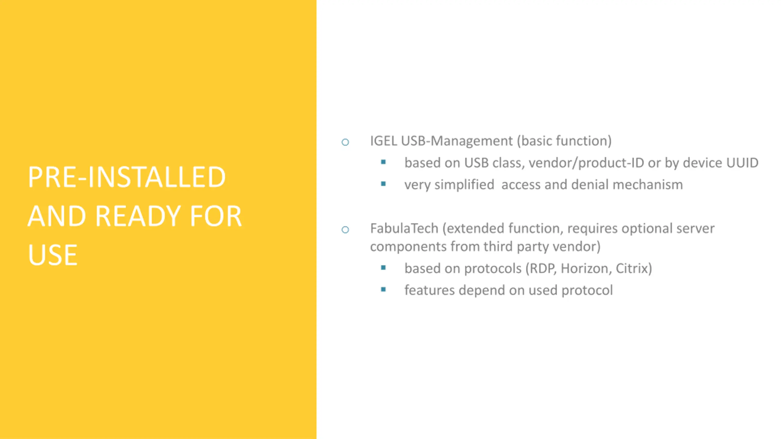 o IGEL USB-Management (basic function) based on USB class, vendor/product-ID or by device UUID very simplified access and denial mechanism PRE-INSTALLED AND READY FOR USE o FabulaTech (extended function, requires optional server components from third party vendor) based on protocols (RDP, Horizon, Citrix) features depend on used protocol
