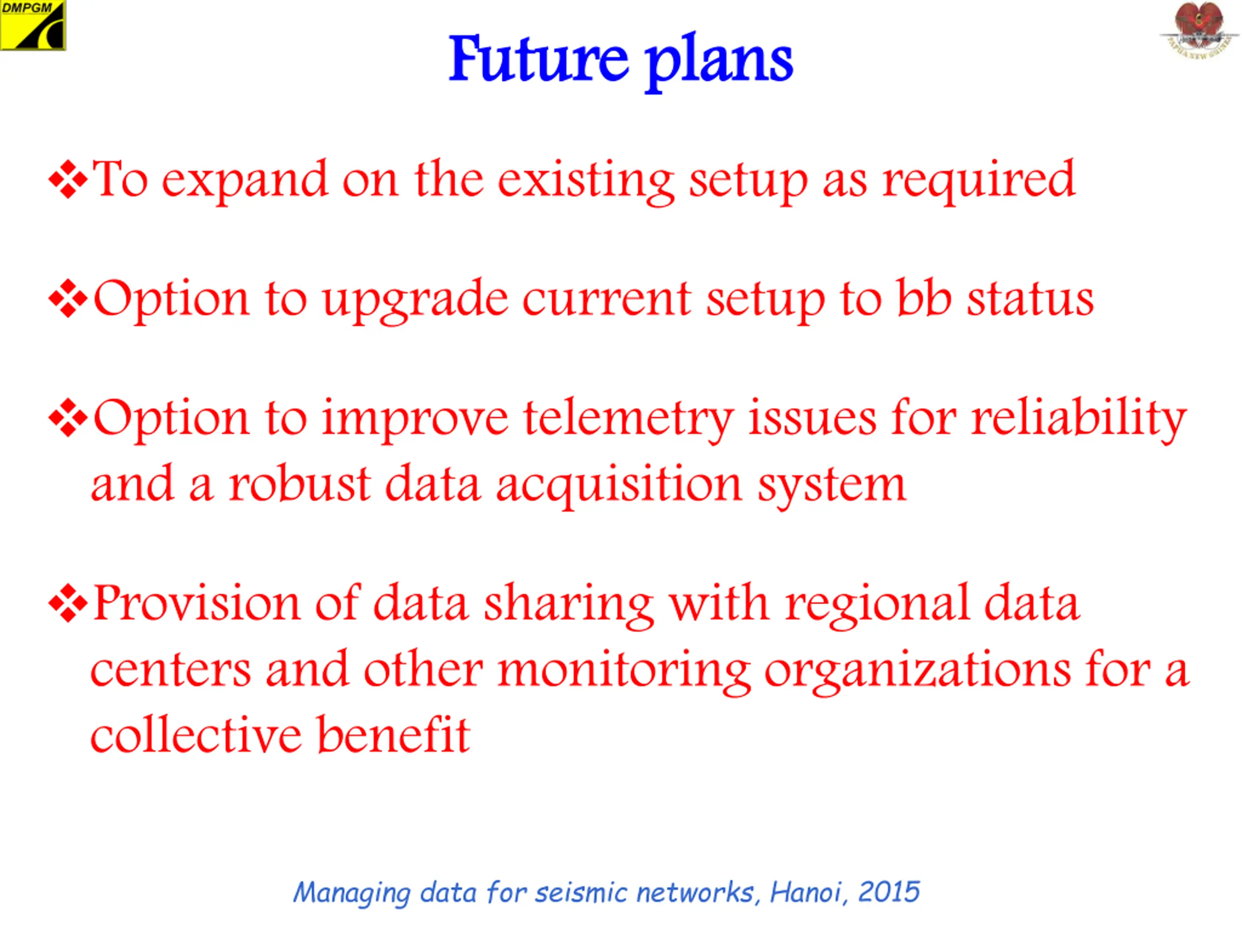 Future plans Future plans To expand on the existing setup as required Option to upgrade current setup to bb status Option to improve telemetry issues for reliability and a robust data acquisition system Provision of data sharing with regional data centers and other monitoring organizations for a collective benefit Managing data for seismic networks, Hanoi, 2015