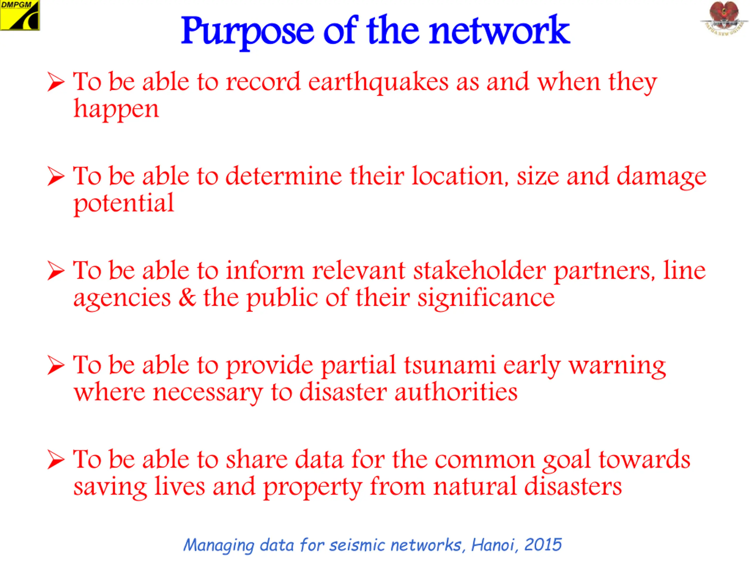 Purpose of the network To be able to record earthquakes as and when they happen Purpose of the network To be able to determine their location, size and damage potential To be able to inform relevant stakeholder partners, line agencies & the public of their significance To be able to provide partial tsunami early warning where necessary to disaster authorities To be able to share data for the common goal towards saving lives and property from natural disasters Managing data for seismic networks, Hanoi, 2015