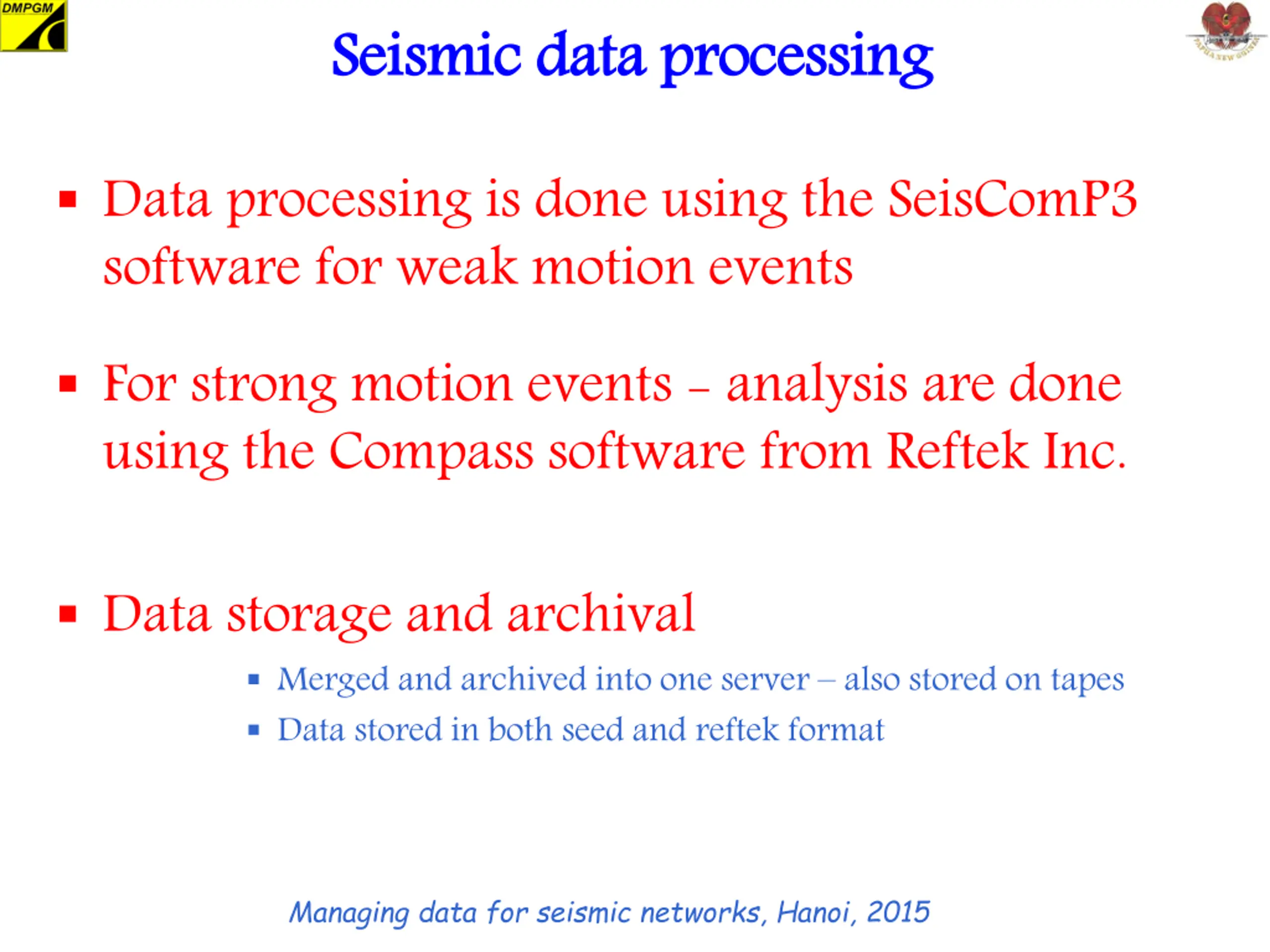 Seismic data processing Seismic data processing Data processing is done using the SeisComP3 software for weak motion events For strong motion events - analysis are done using the Compass software from Reftek Inc. Data storage and archival Merged and archived into one server also stored on tapes Data stored in both seed and reftek format Managing data for seismic networks, Hanoi, 2015
