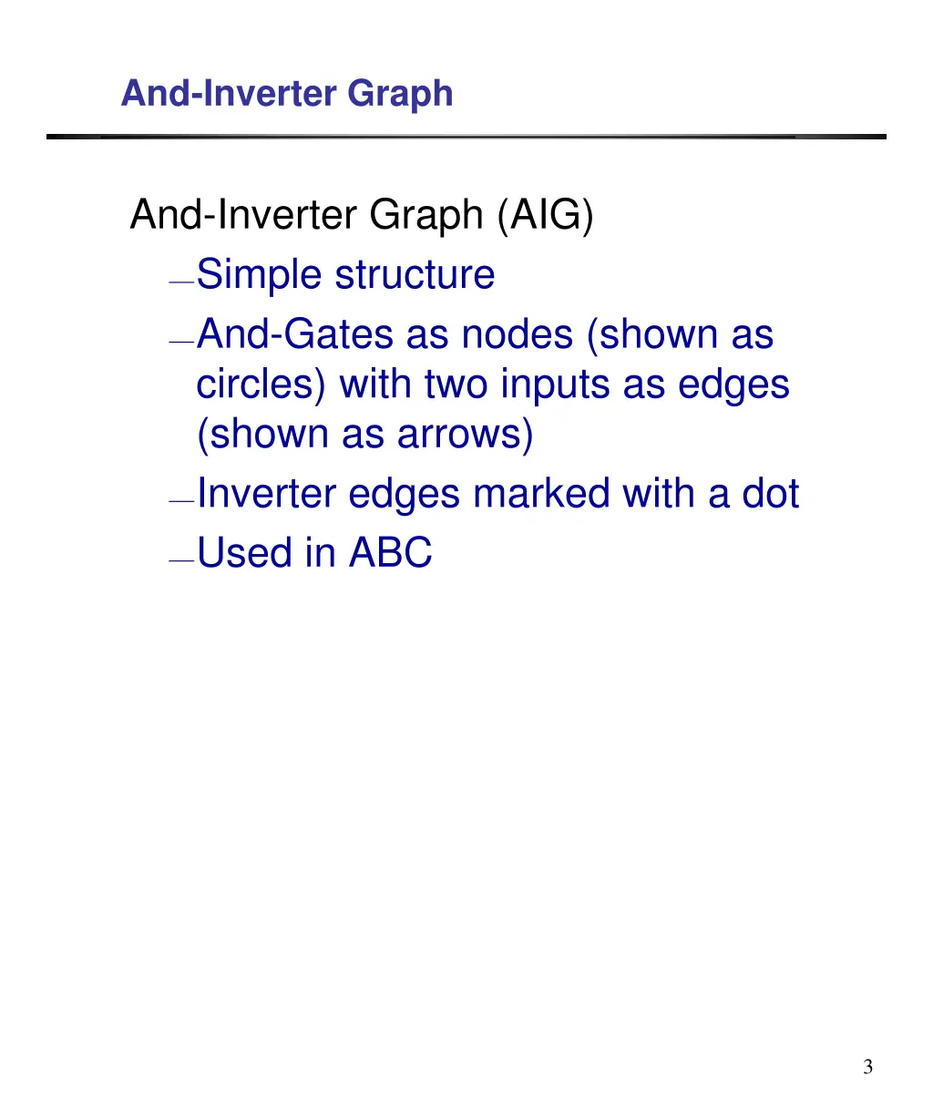 And-Inverter Graph And-Inverter Graph (AIG) Simple structure And-Gates as nodes (shown as circles) with two inputs as edges (shown as arrows) Inverter edges marked with a dot Used in ABC 3