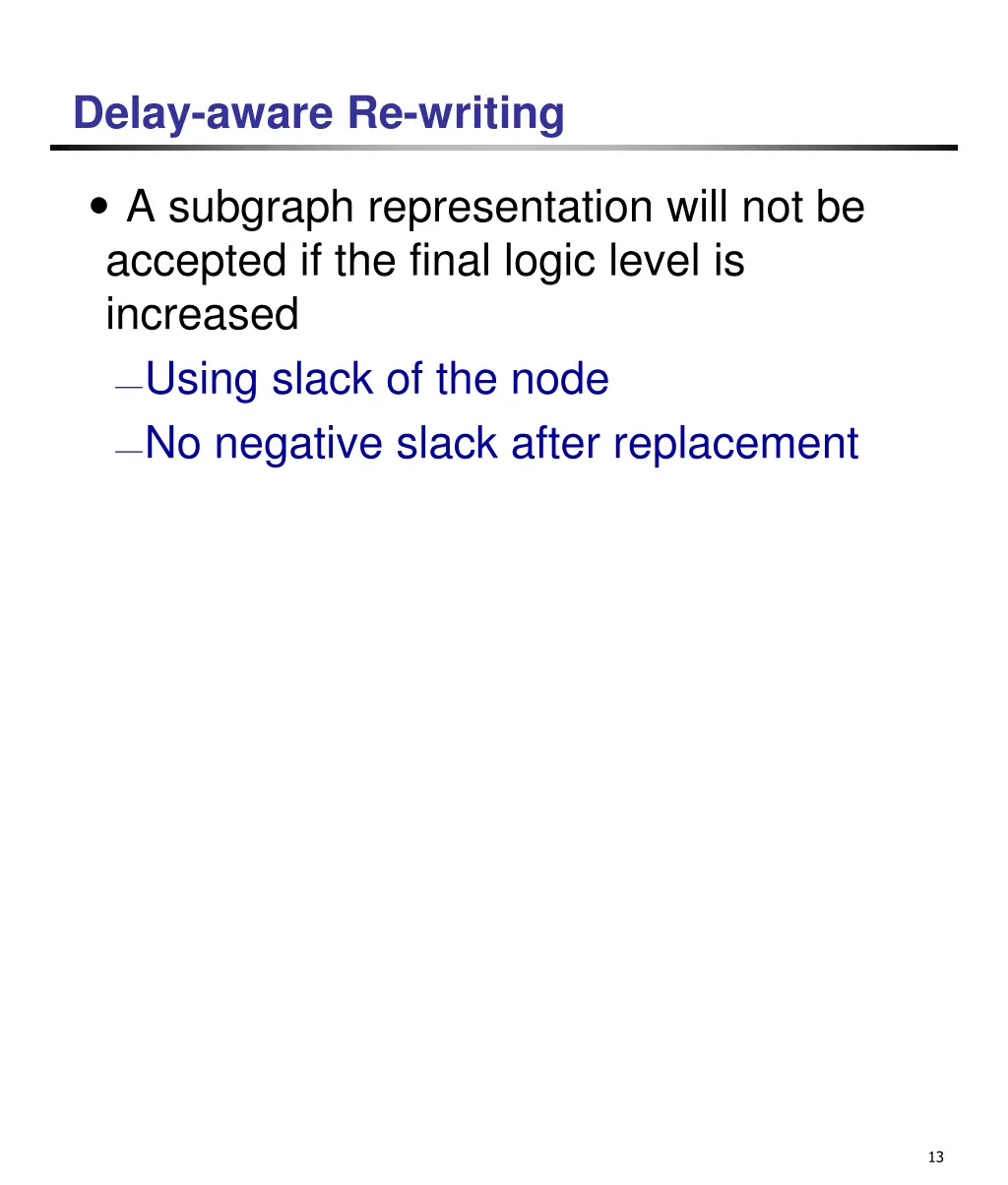 Delay-aware Re-writing A subgraph representation will not be accepted if the final logic level is increased Using slack of the node No negative slack after replacement 13