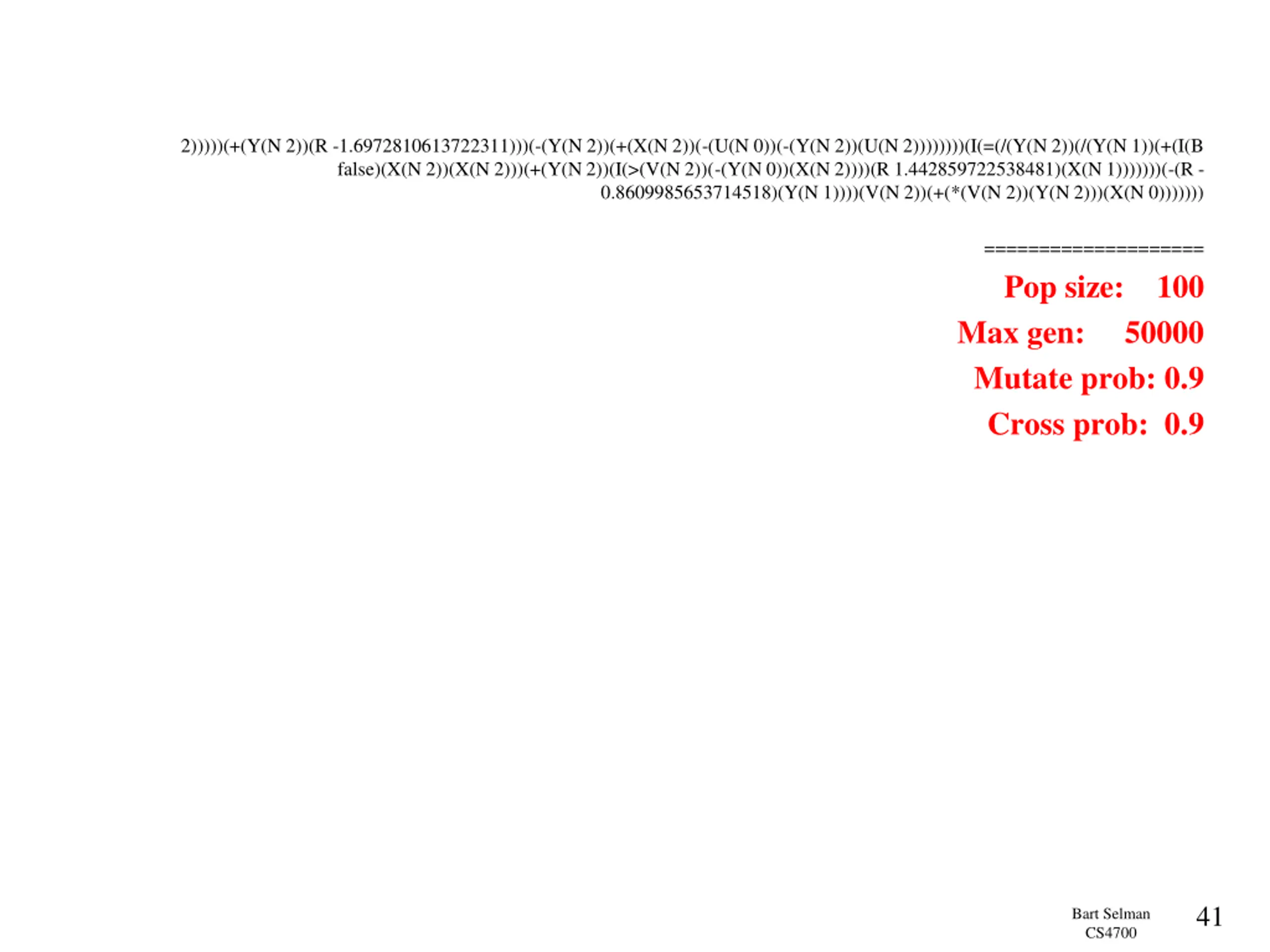 2)))))(+(Y(N 2))(R -1.6972810613722311)))(-(Y(N 2))(+(X(N 2))(-(U(N 0))(-(Y(N 2))(U(N 2))))))))(I(=(/(Y(N 2))(/(Y(N 1))(+(I(B false)(X(N 2))(X(N 2)))(+(Y(N 2))(I(>(V(N 2))(-(Y(N 0))(X(N 2))))(R 1.442859722538481)(X(N 1)))))))(-(R - 0.8609985653714518)(Y(N 1))))(V(N 2))(+(*(V(N 2))(Y(N 2)))(X(N 0))))))) ==================== Pop size: 100 Max gen: 50000 Mutate prob: 0.9 Cross prob: 0.9 41 Bart Selman CS4700