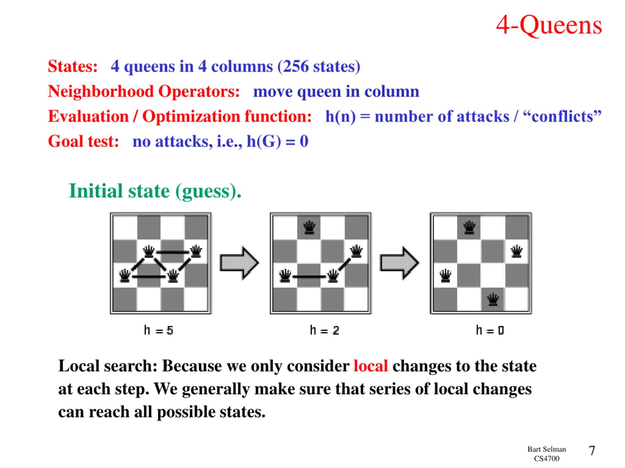 4-Queens States: 4 queens in 4 columns (256 states) Neighborhood Operators: move queen in column Evaluation / Optimization function: h(n) = number of attacks / conflicts Goal test: no attacks, i.e., h(G) = 0 Initial state (guess). Local search: Because we only consider local changes to the state at each step. We generally make sure that series of local changes can reach all possible states. 7 Bart Selman CS4700