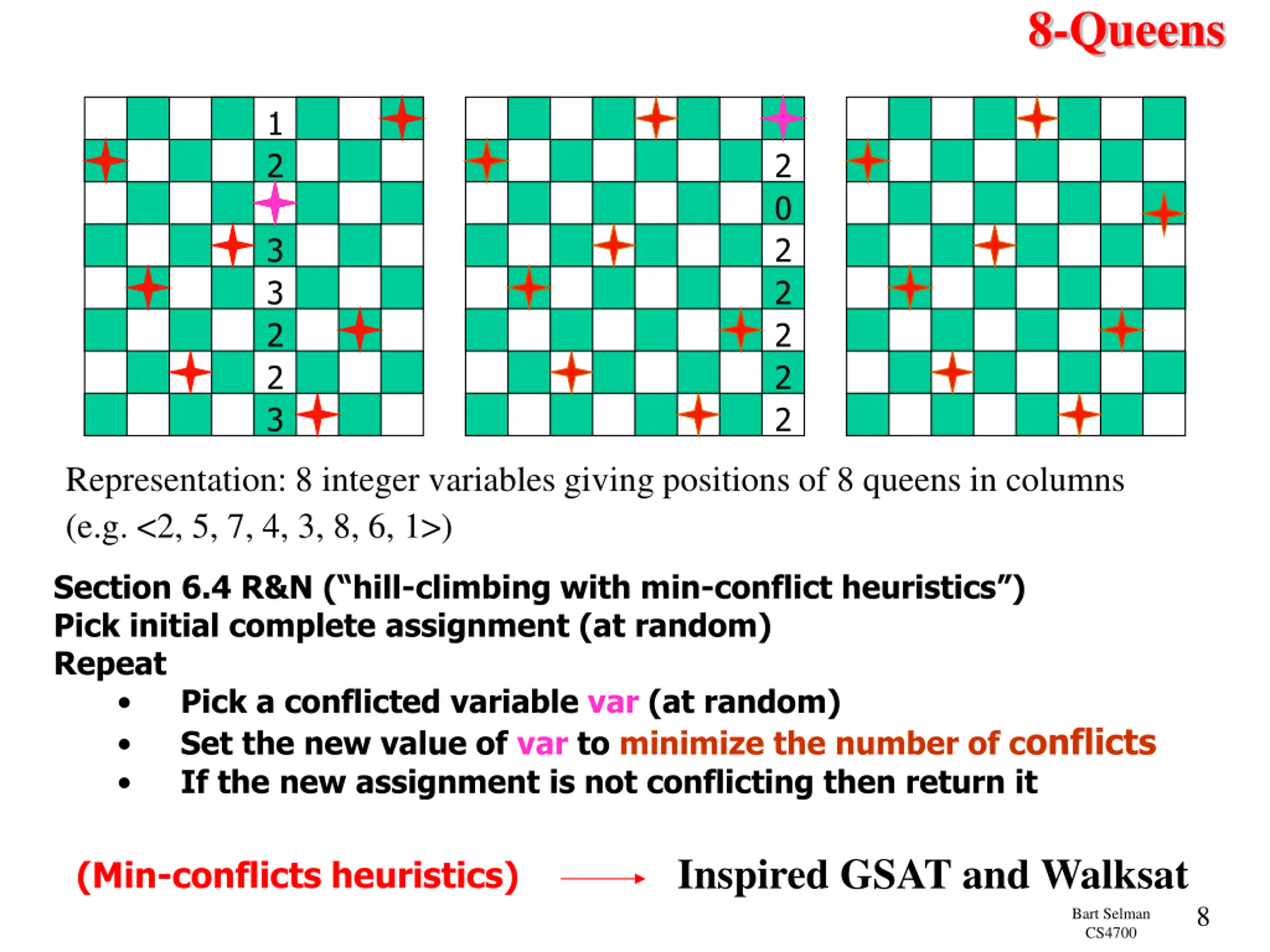 8-Queens 1 2 2 0 3 3 2 2 3 2 2 2 2 2 Representation: 8 integer variables giving positions of 8 queens in columns (e.g. <2, 5, 7, 4, 3, 8, 6, 1>) Section 6.4 R&N ( hill-climbing with min-conflict heuristics ) Pick initial complete assignment (at random) Repeat Pick a conflicted variable var (at random) Set the new value of var to minimize the number of conflicts If the new assignment is not conflicting then return it Inspired GSAT and Walksat (Min-conflicts heuristics) 8 Bart Selman CS4700