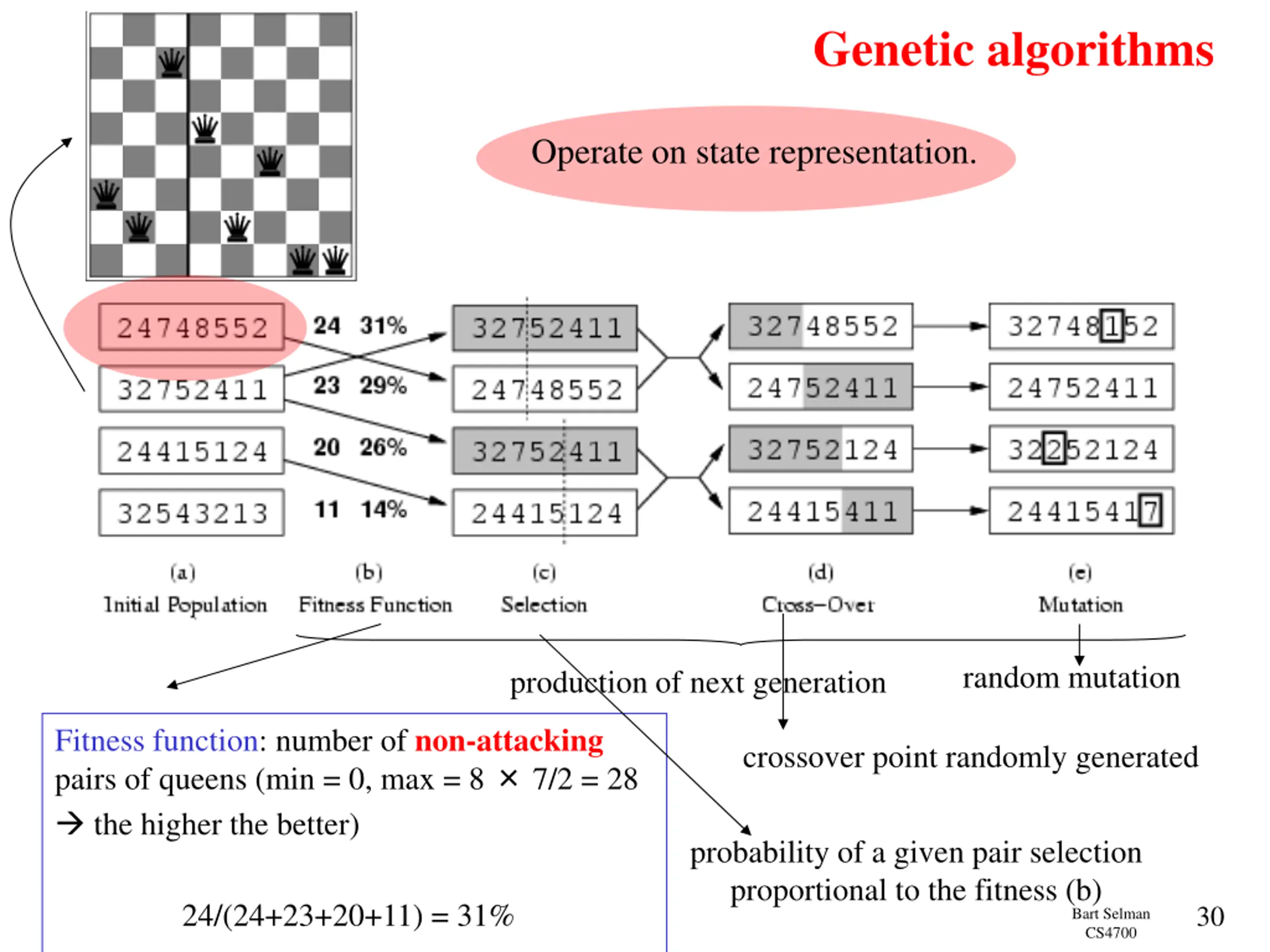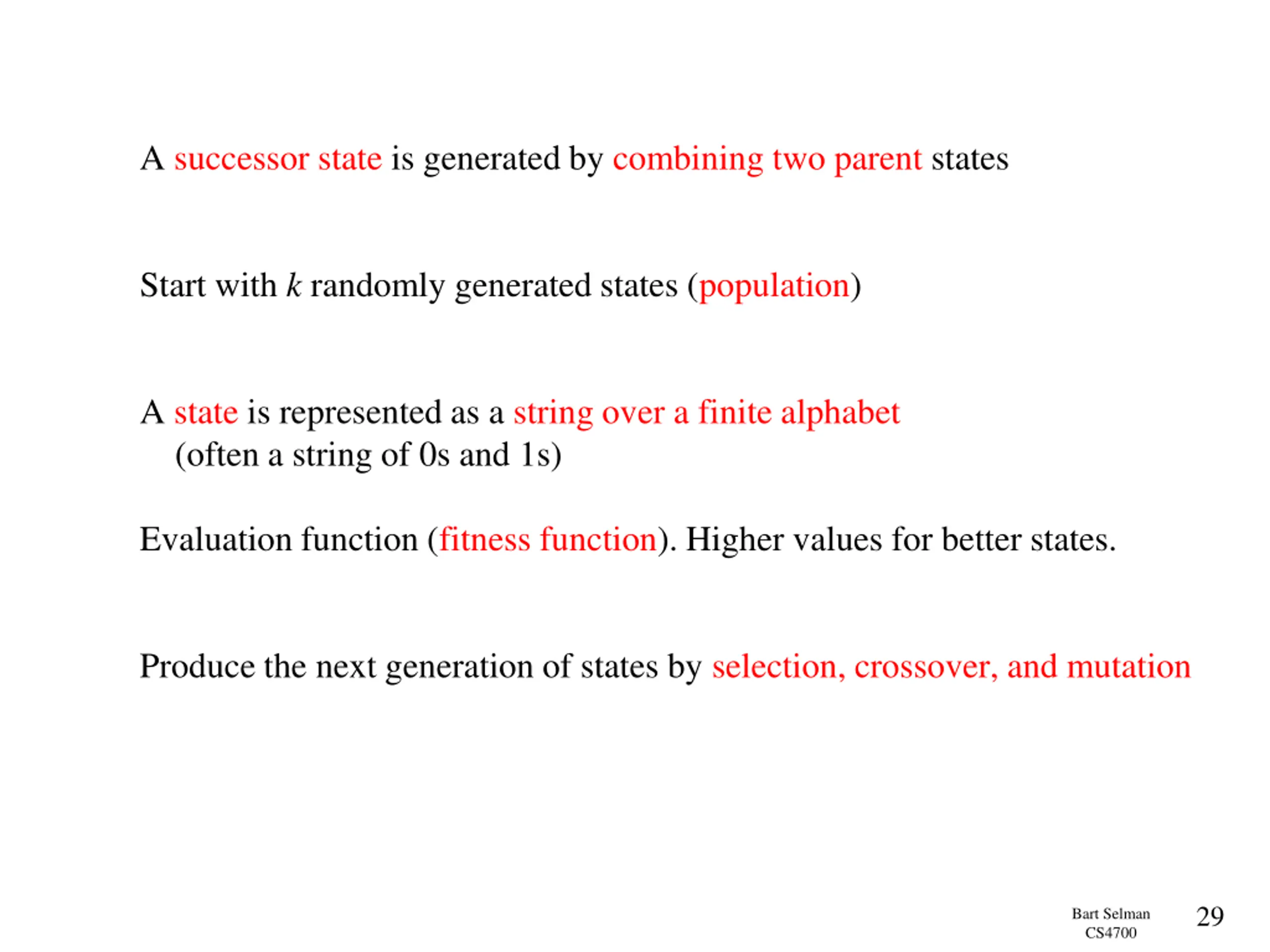 A successor state is generated by combining two parent states Start with k randomly generated states (population) A state is represented as a string over a finite alphabet (often a string of 0s and 1s) Evaluation function (fitness function). Higher values for better states. Produce the next generation of states by selection, crossover, and mutation 29 Bart Selman CS4700