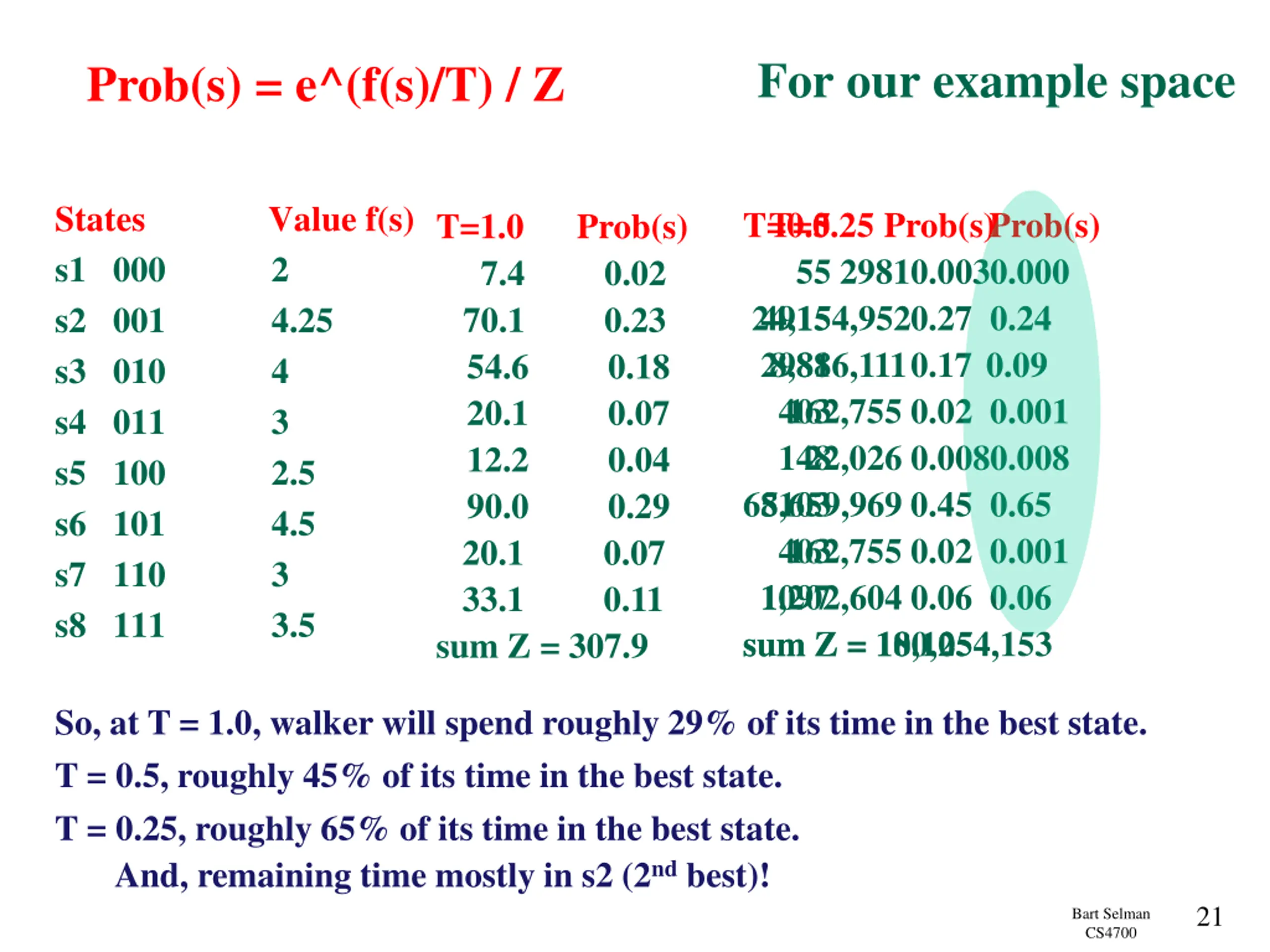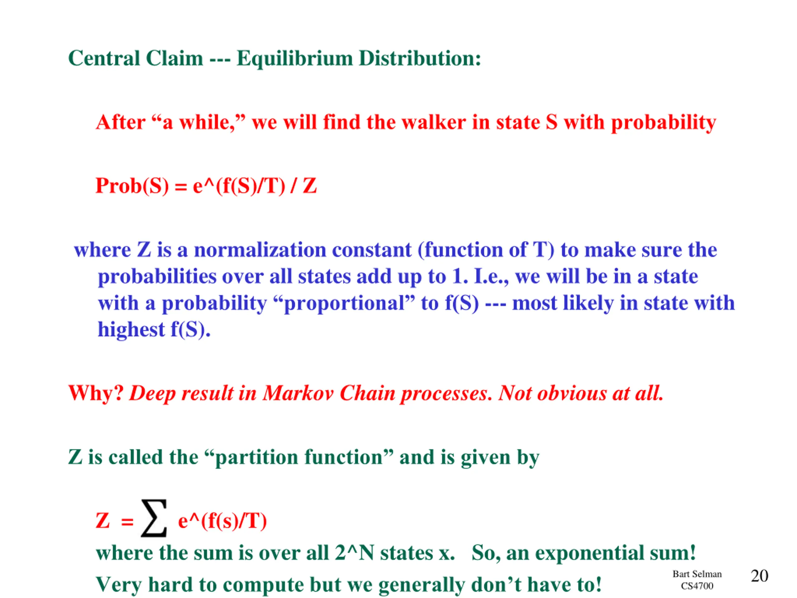 Central Claim --- Equilibrium Distribution: After a while, we will find the walker in state S with probability Prob(S) = e^(f(S)/T) / Z where Z is a normalization constant (function of T) to make sure the probabilities over all states add up to 1. I.e., we will be in a state with a probability proportional to f(S) --- most likely in state with highest f(S). Why? Deep result in Markov Chain processes. Not obvious at all. Z is called the partition function and is given by Z = e^(f(s)/T) where the sum is over all 2^N states x. So, an exponential sum! Very hard to compute but we generally don t have to! 20 Bart Selman CS4700