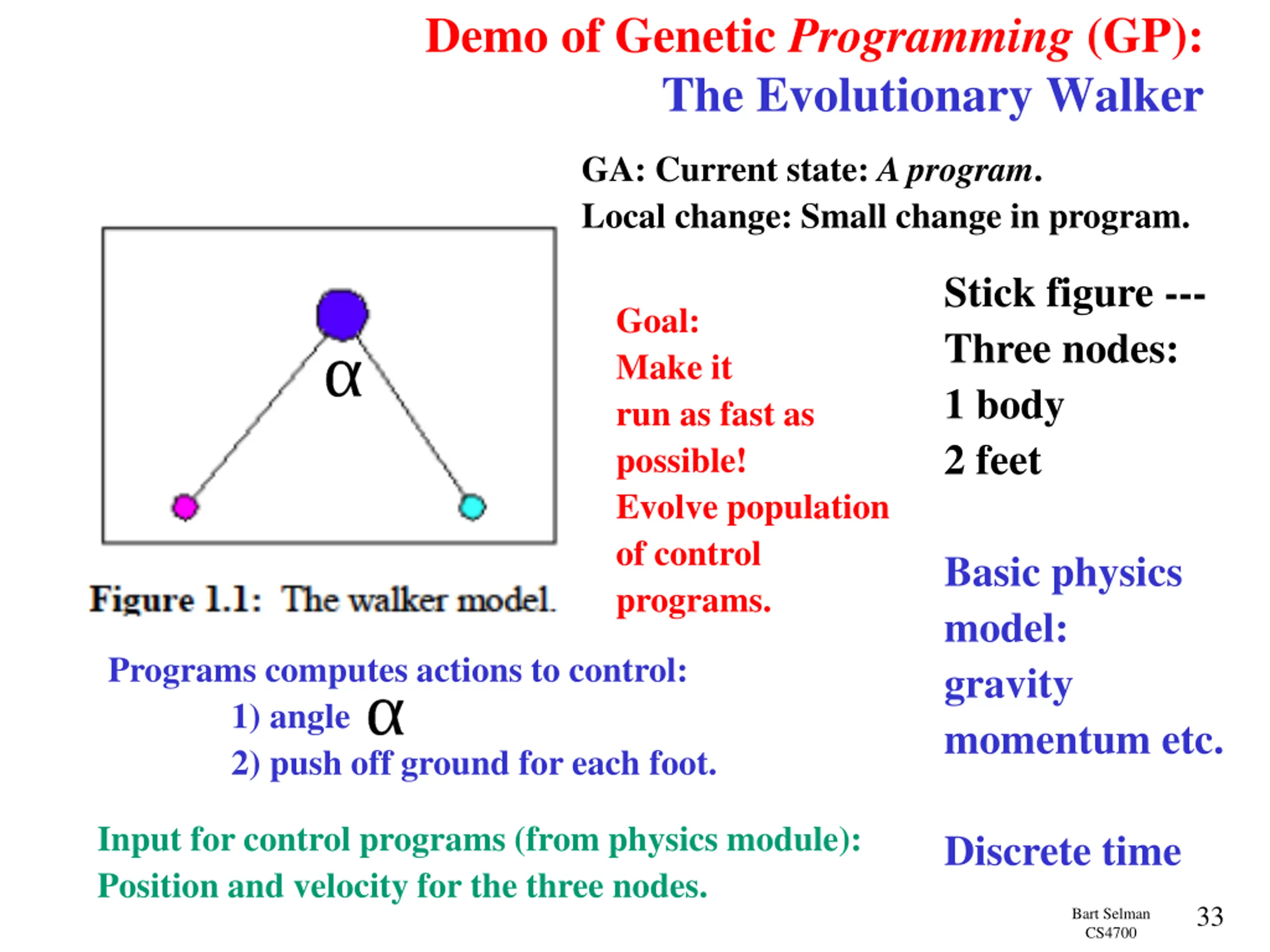 Control programming language: Example: Basically, computes a real number to set angle (or push strength) for next time step. Body and feet will each evolve their own control program. 34 Bart Selman CS4700