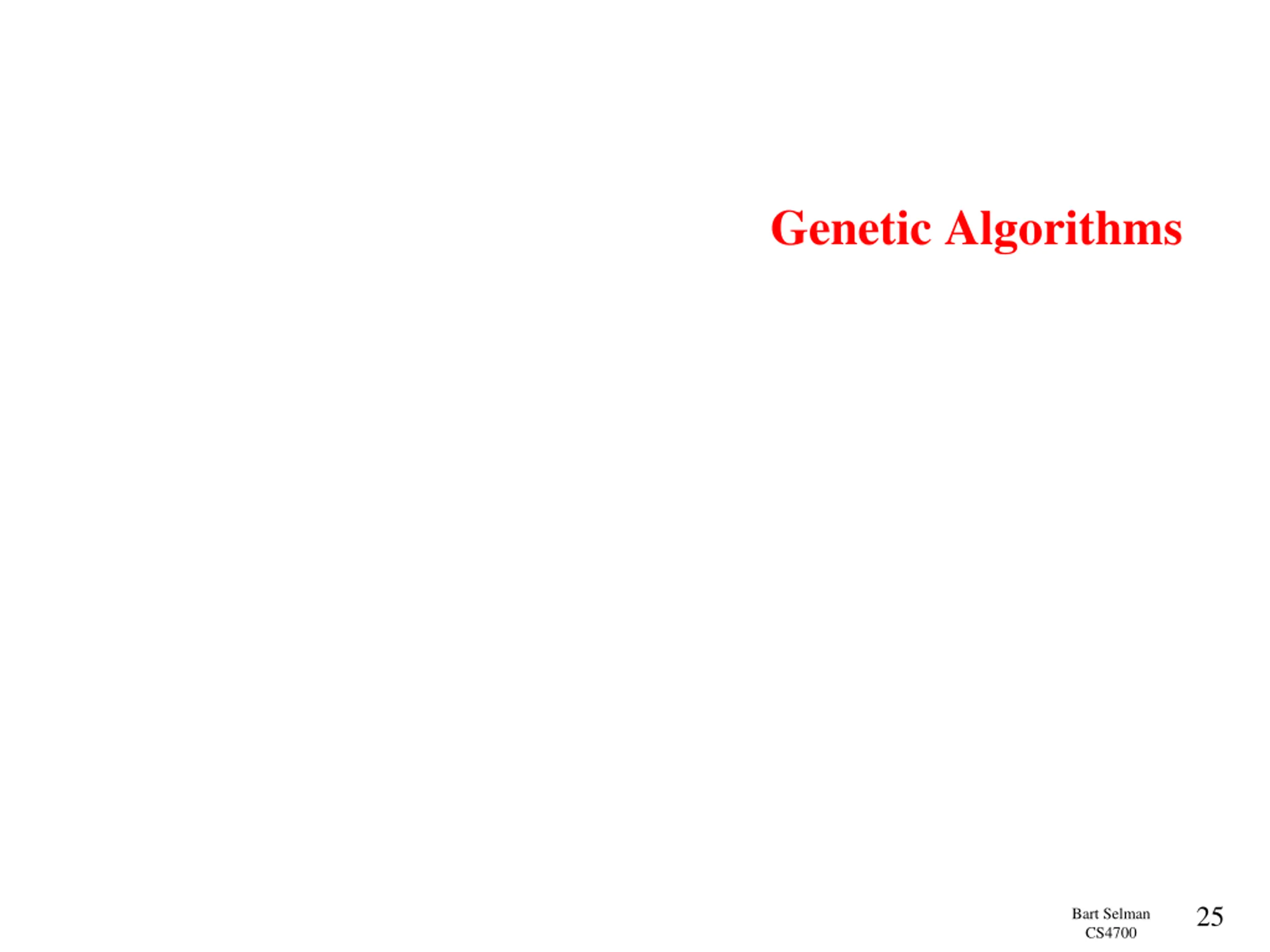 Genetic Algorithms Another class of iterative improvement algorithms A genetic algorithm maintains a population of candidate solutions for the problem at hand, and makes it evolve by iteratively applying a set of stochastic operators Inspired by the biological evolution process Uses concepts of Natural Selection and Genetic Inheritance (Darwin 1859) Originally developed by John Holland (1975) 26 Bart Selman CS4700