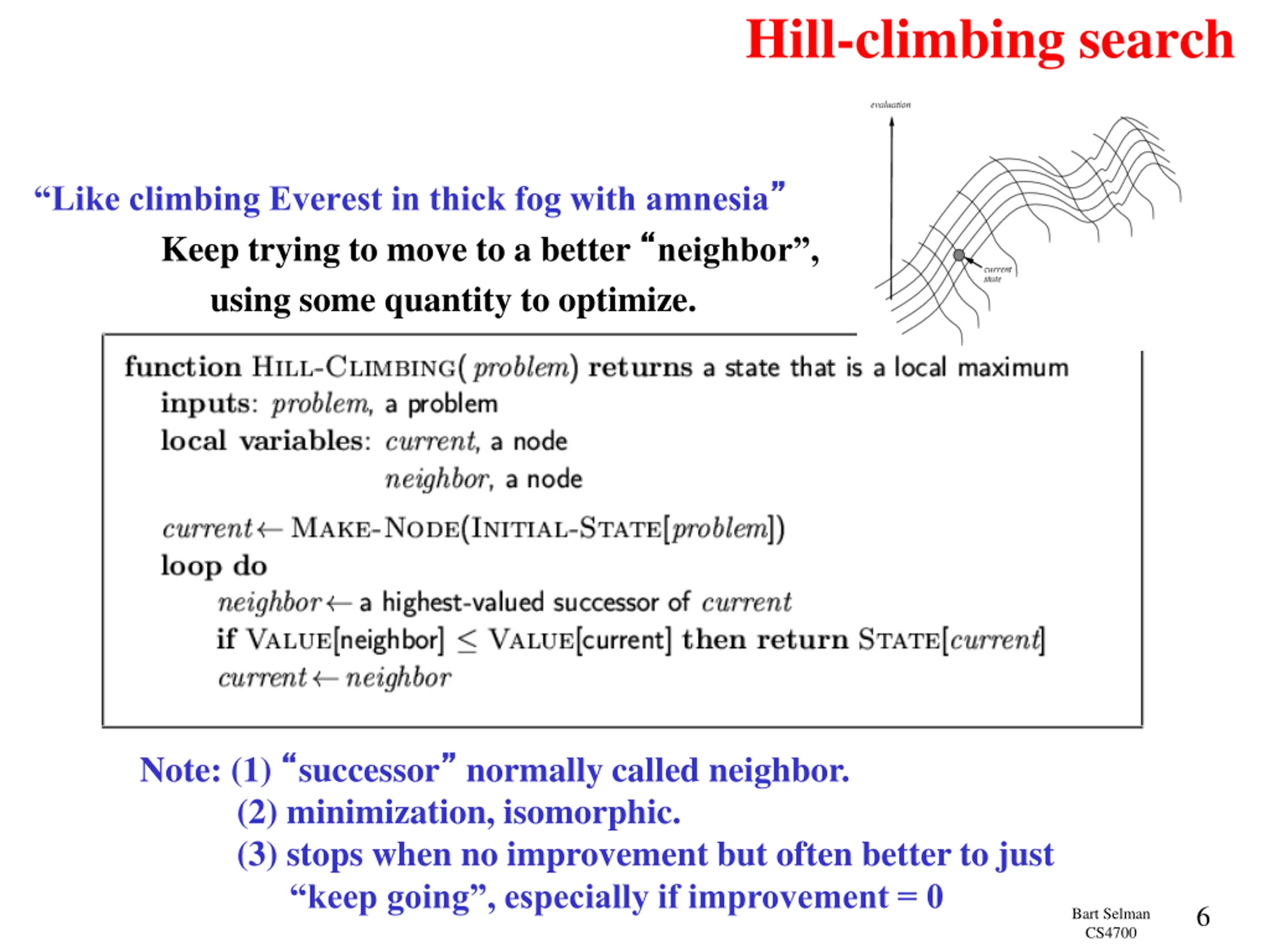 Hill-climbing search Like climbing Everest in thick fog with amnesia Keep trying to move to a better neighbor , using some quantity to optimize. Note: (1) successor normally called neighbor. (2) minimization, isomorphic. (3) stops when no improvement but often better to just keep going , especially if improvement = 0 6 Bart Selman CS4700