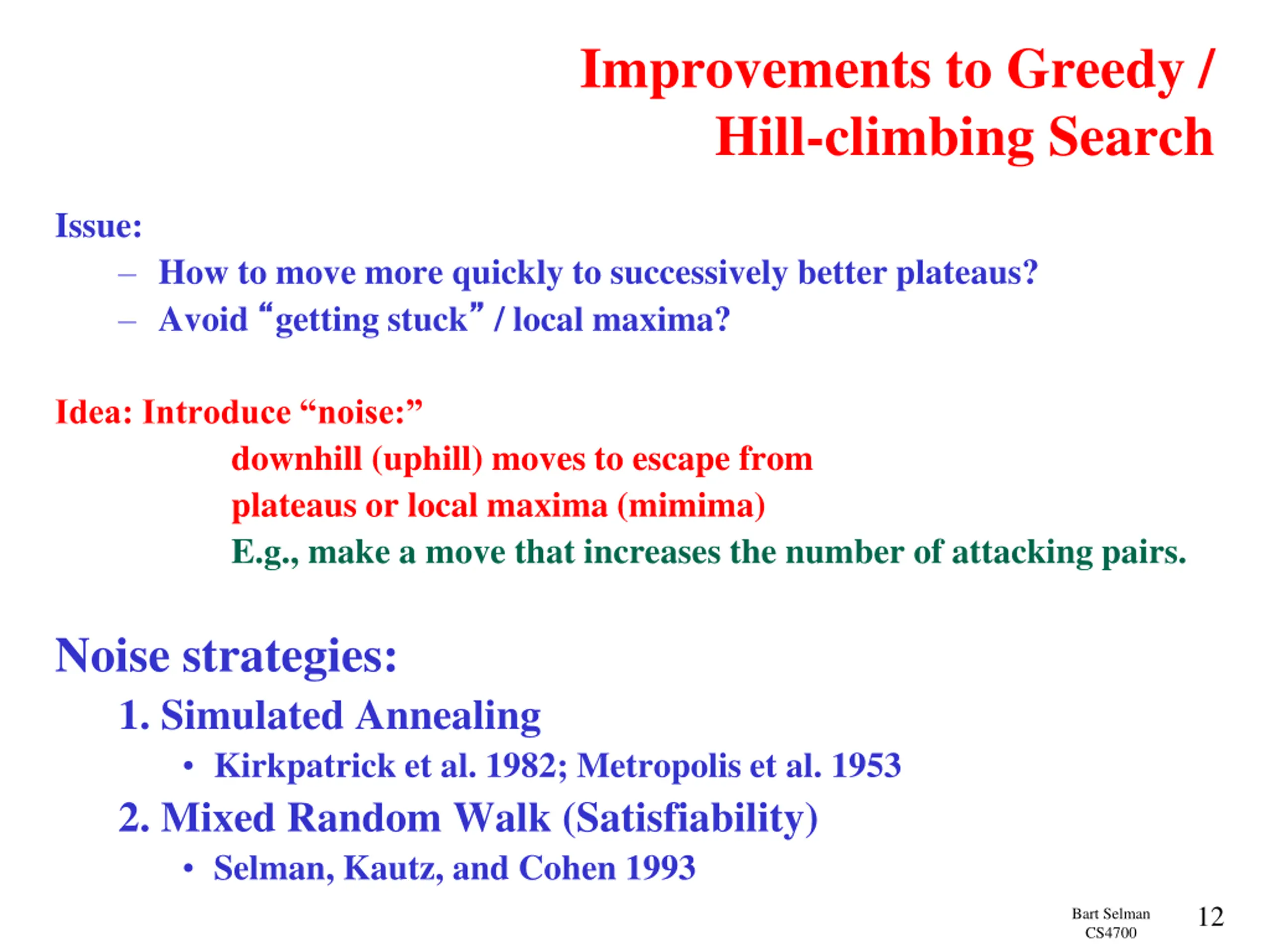 Improvements to Greedy / Hill-climbing Search Issue: How to move more quickly to successively better plateaus? Avoid getting stuck / local maxima? Idea: Introduce noise: downhill (uphill) moves to escape from plateaus or local maxima (mimima) E.g., make a move that increases the number of attacking pairs. Noise strategies: 1. Simulated Annealing Kirkpatrick et al. 1982; Metropolis et al. 1953 2. Mixed Random Walk (Satisfiability) Selman, Kautz, and Cohen 1993 12 Bart Selman CS4700
