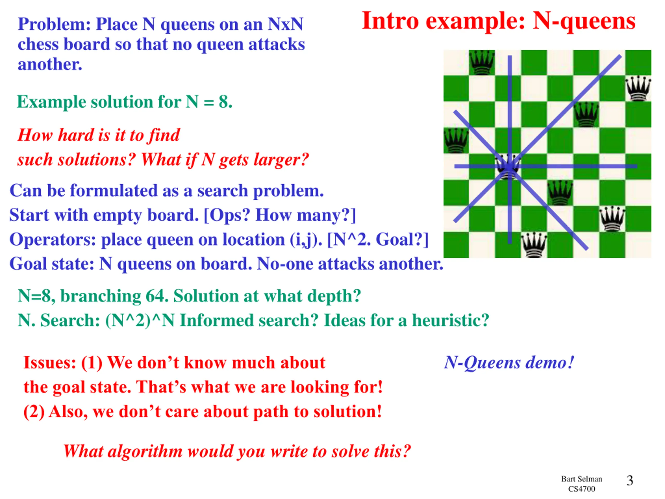 Intro example: N-queens Problem: Place N queens on an NxN chess board so that no queen attacks another. Example solution for N = 8. How hard is it to find such solutions? What if N gets larger? Can be formulated as a search problem. Start with empty board. [Ops? How many?] Operators: place queen on location (i,j). [N^2. Goal?] Goal state: N queens on board. No-one attacks another. N=8, branching 64. Solution at what depth? N. Search: (N^2)^N Informed search? Ideas for a heuristic? N-Queens demo! Issues: (1) We don t know much about the goal state. That s what we are looking for! (2) Also, we don t care about path to solution! What algorithm would you write to solve this? 3 Bart Selman CS4700