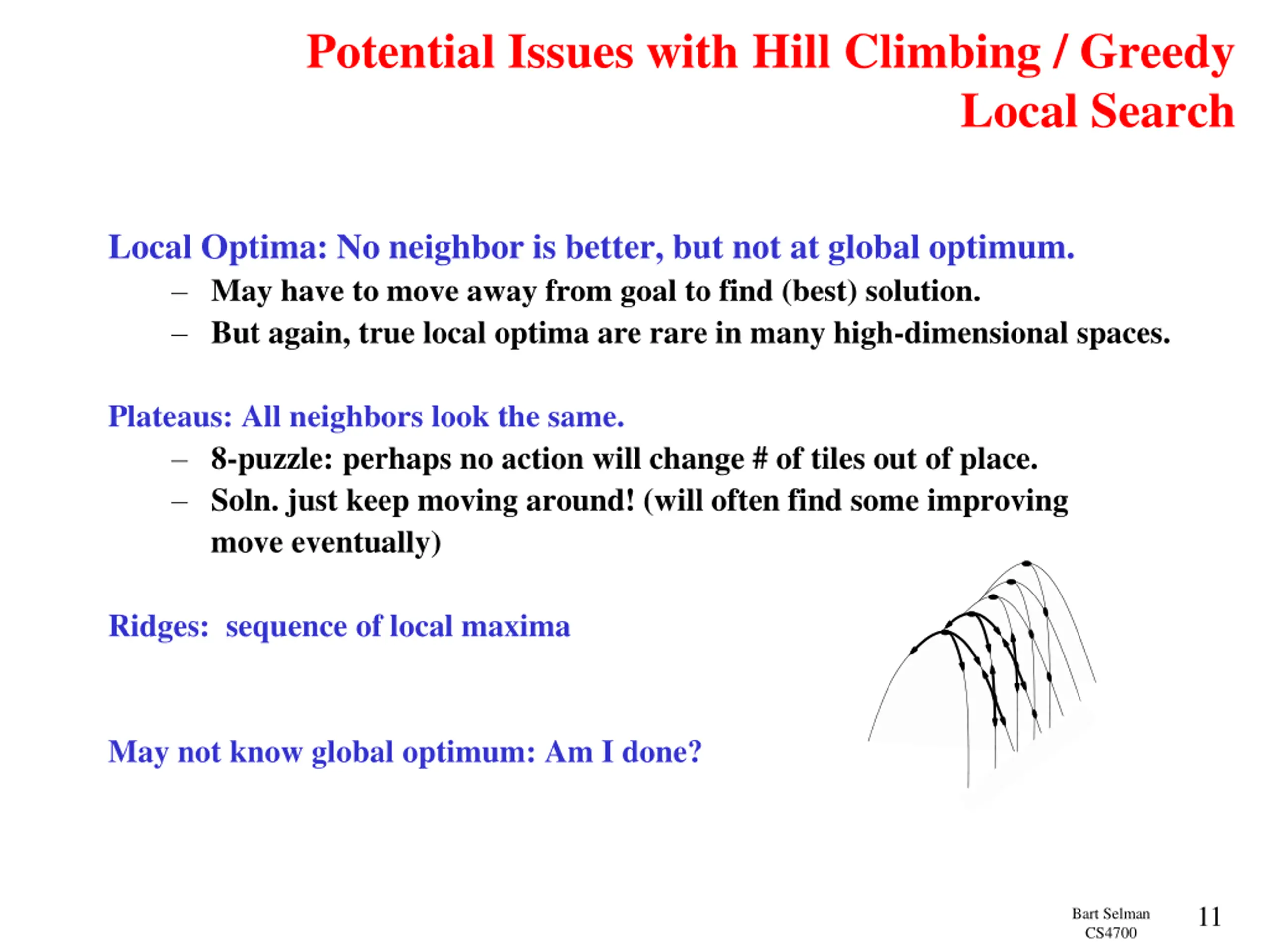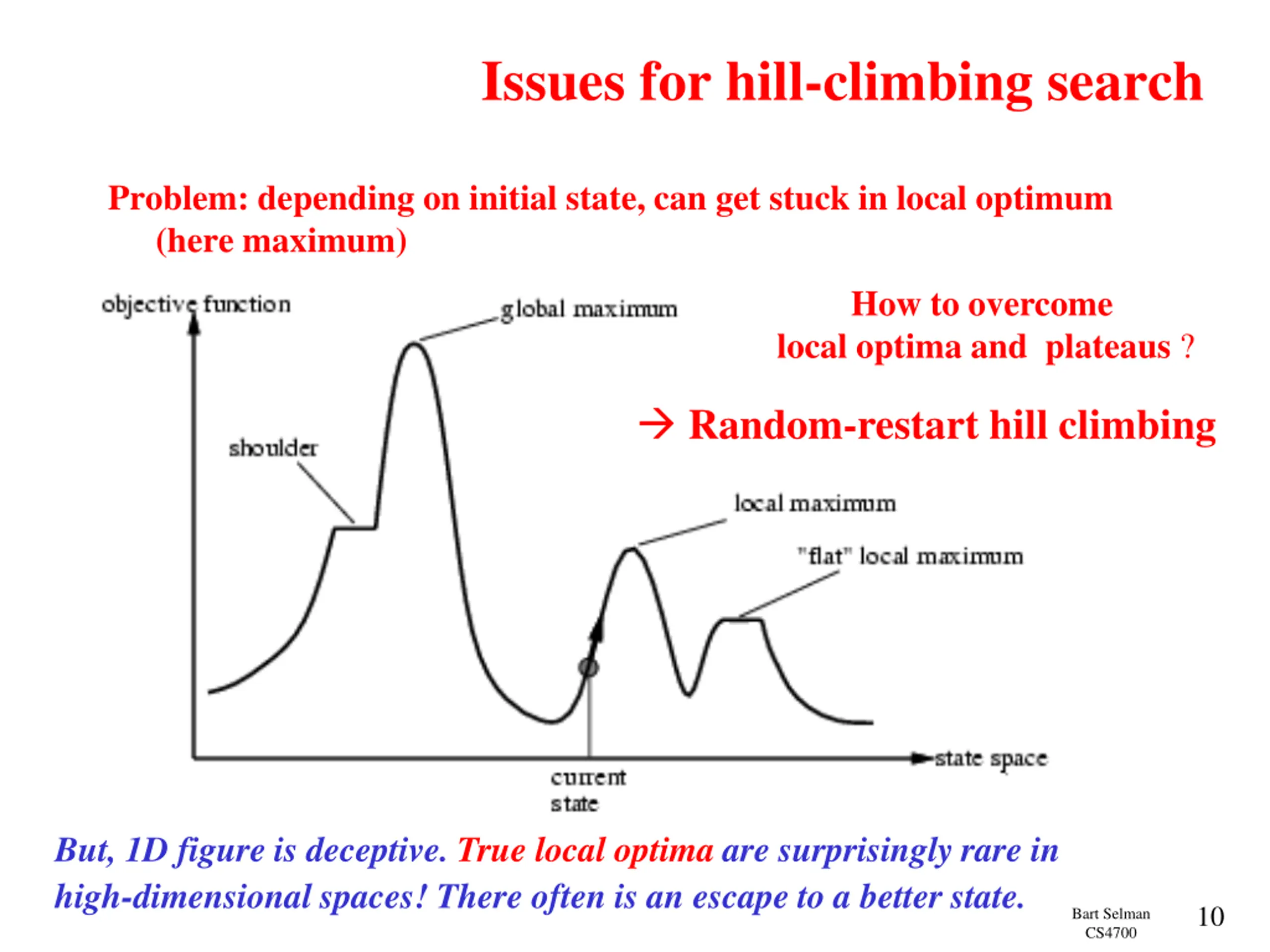 Issues for hill-climbing search Problem: depending on initial state, can get stuck in local optimum (here maximum) How to overcome local optima and plateaus ? Random-restart hill climbing But, 1D figure is deceptive. True local optima are surprisingly rare in high-dimensional spaces! There often is an escape to a better state. 10 Bart Selman CS4700