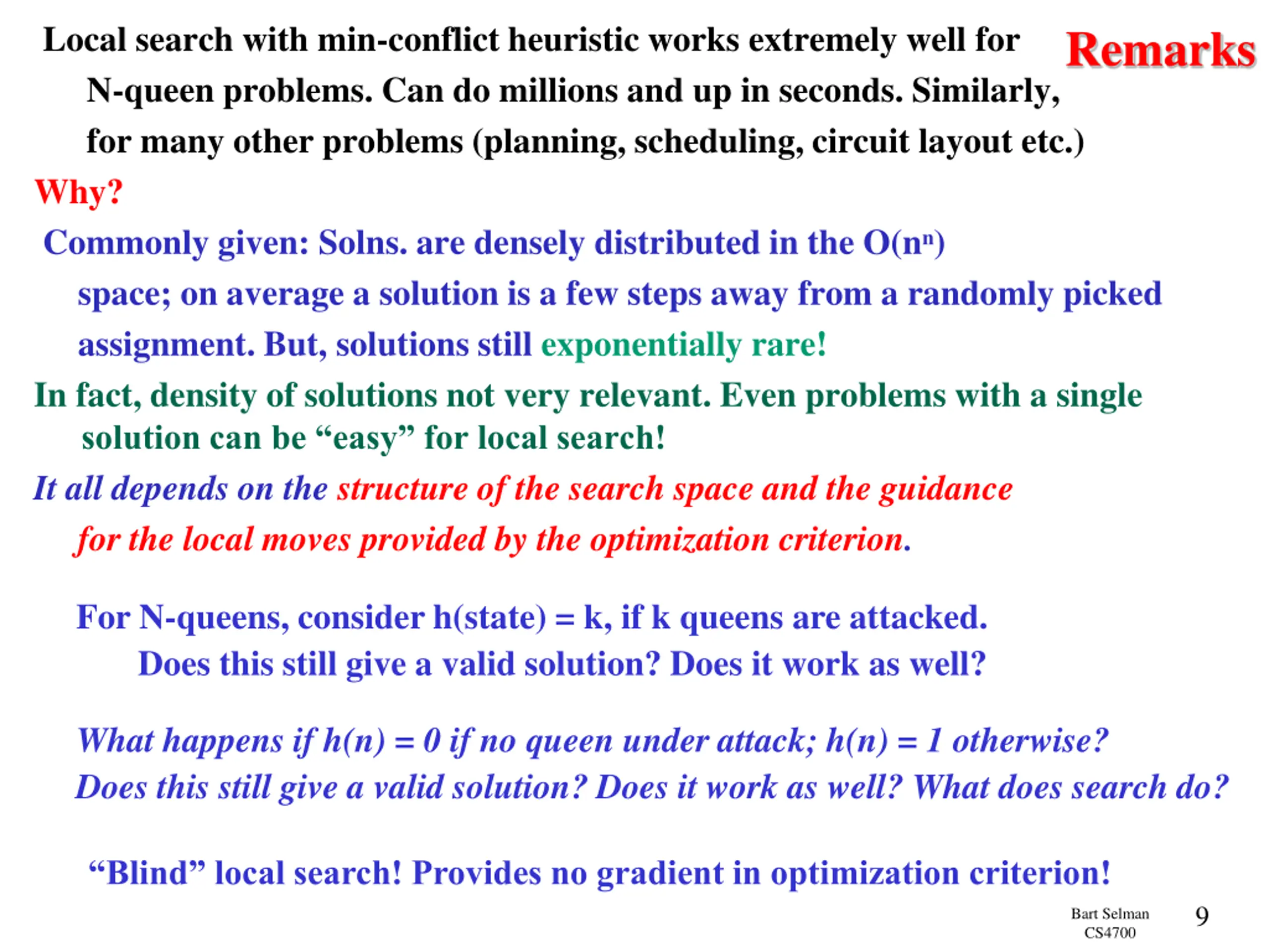 Local search with min-conflict heuristic works extremely well for N-queen problems. Can do millions and up in seconds. Similarly, for many other problems (planning, scheduling, circuit layout etc.) Why? Commonly given: Solns. are densely distributed in the O(nn) space; on average a solution is a few steps away from a randomly picked assignment. But, solutions still exponentially rare! In fact, density of solutions not very relevant. Even problems with a single solution can be easy for local search! It all depends on the structure of the search space and the guidance for the local moves provided by the optimization criterion. Remarks For N-queens, consider h(state) = k, if k queens are attacked. Does this still give a valid solution? Does it work as well? What happens if h(n) = 0 if no queen under attack; h(n) = 1 otherwise? Does this still give a valid solution? Does it work as well? What does search do? Blind local search! Provides no gradient in optimization criterion! 9 Bart Selman CS4700