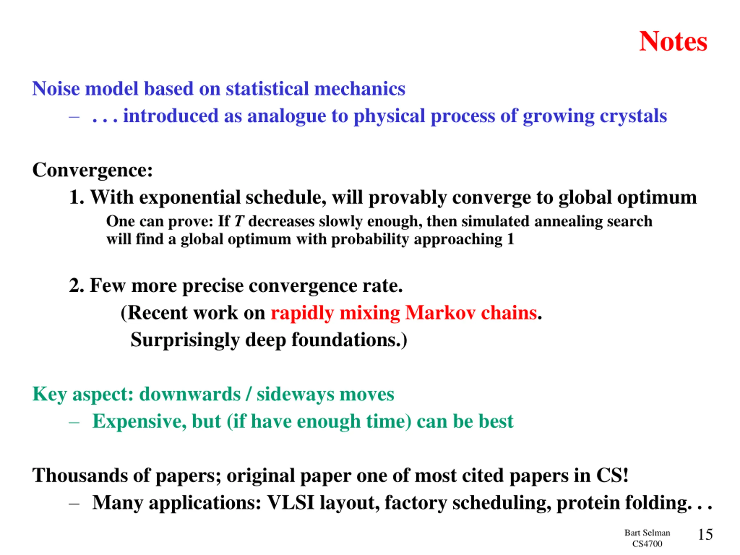 Notes Noise model based on statistical mechanics . . . introduced as analogue to physical process of growing crystals Convergence: 1. With exponential schedule, will provably converge to global optimum One can prove: If T decreases slowly enough, then simulated annealing search will find a global optimum with probability approaching 1 2. Few more precise convergence rate. (Recent work on rapidly mixing Markov chains. Surprisingly deep foundations.) Key aspect: downwards / sideways moves Expensive, but (if have enough time) can be best Thousands of papers; original paper one of most cited papers in CS! Many applications: VLSI layout, factory scheduling, protein folding. . . 15 Bart Selman CS4700