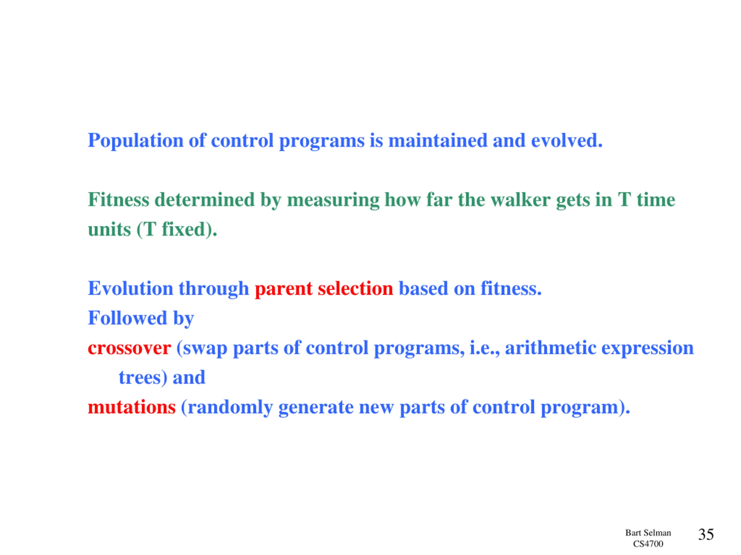 Population of control programs is maintained and evolved. Fitness determined by measuring how far the walker gets in T time units (T fixed). Evolution through parent selection based on fitness. Followed by crossover (swap parts of control programs, i.e., arithmetic expression trees) and mutations (randomly generate new parts of control program). 35 Bart Selman CS4700