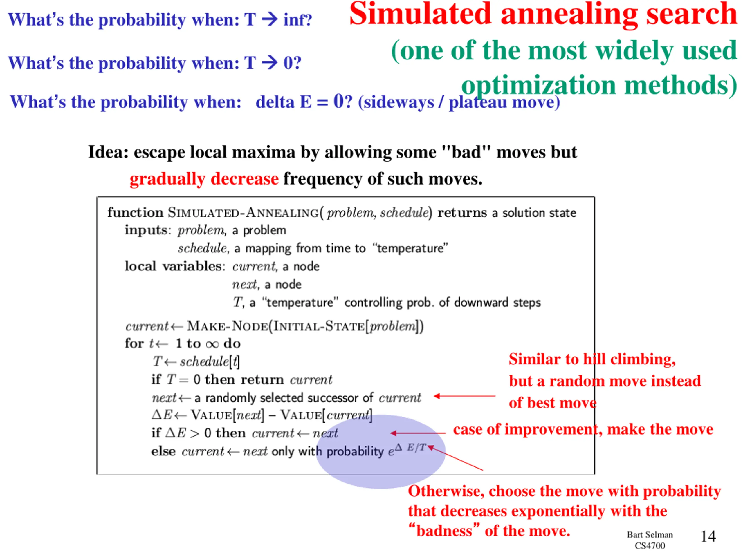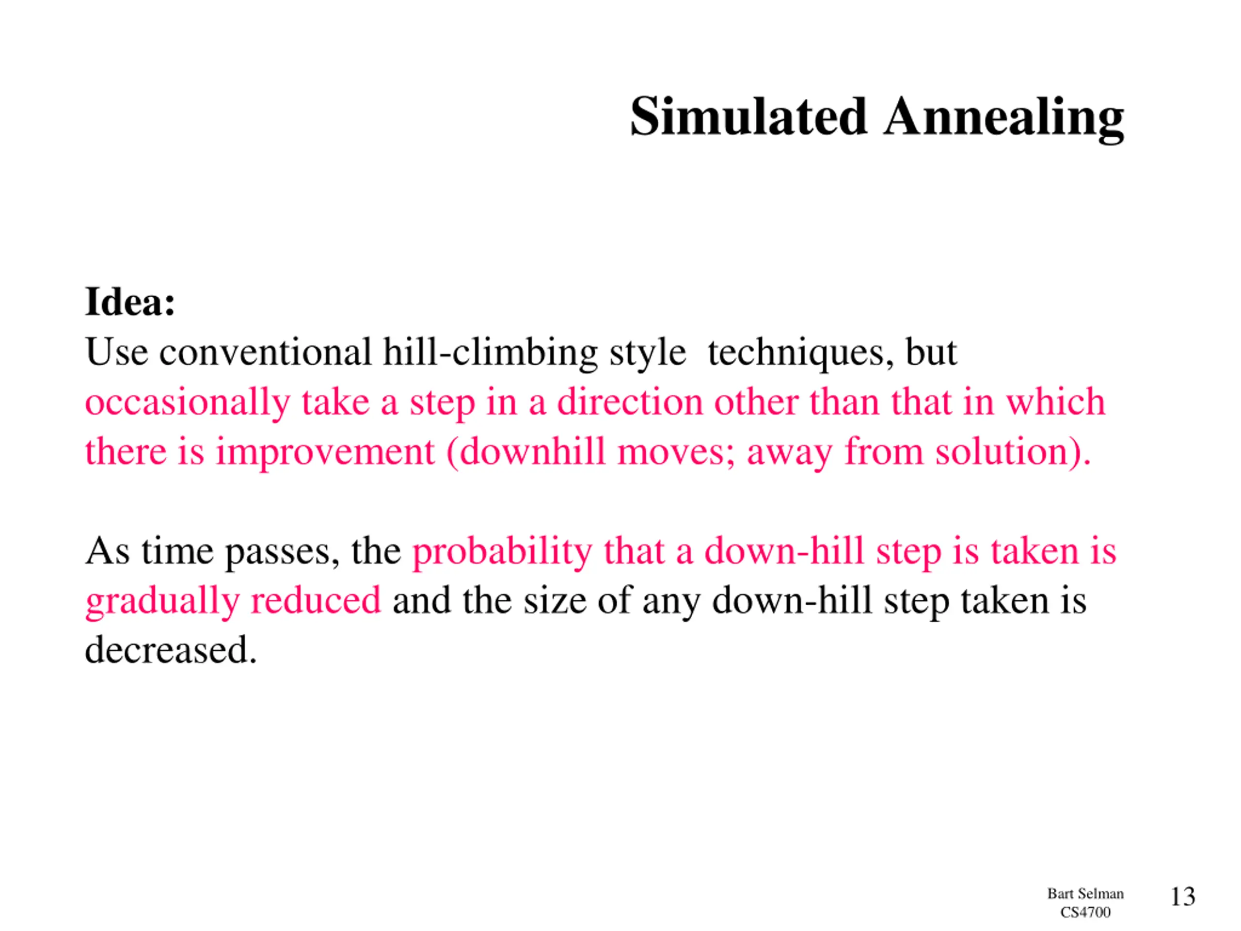 Simulated Annealing Idea: Use conventional hill-climbing style techniques, but occasionally take a step in a direction other than that in which there is improvement (downhill moves; away from solution). As time passes, the probability that a down-hill step is taken is gradually reduced and the size of any down-hill step taken is decreased. 13 Bart Selman CS4700