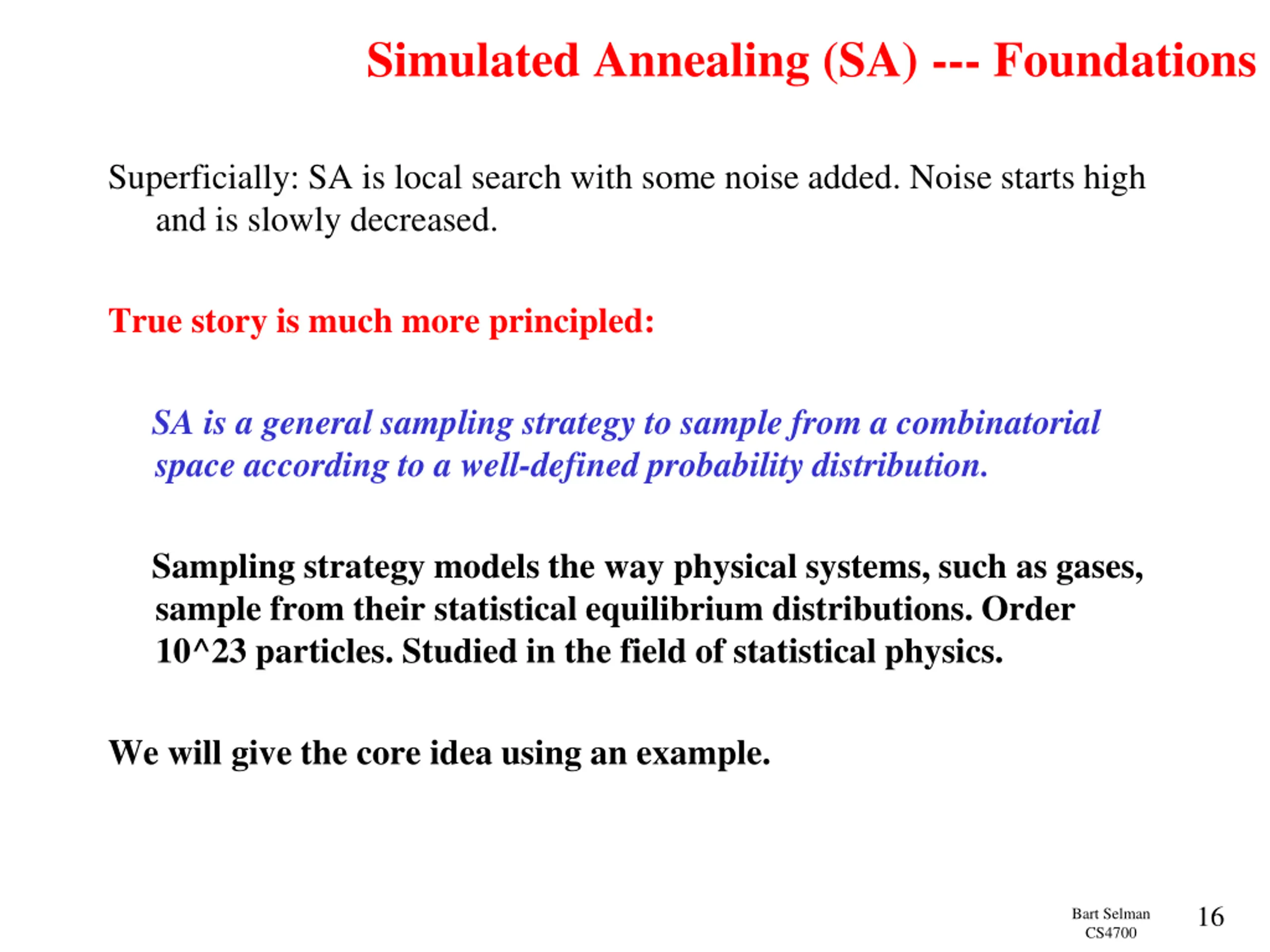 Simulated Annealing (SA) --- Foundations Superficially: SA is local search with some noise added. Noise starts high and is slowly decreased. True story is much more principled: SA is a general sampling strategy to sample from a combinatorial space according to a well-defined probability distribution. Sampling strategy models the way physical systems, such as gases, sample from their statistical equilibrium distributions. Order 10^23 particles. Studied in the field of statistical physics. We will give the core idea using an example. 16 Bart Selman CS4700