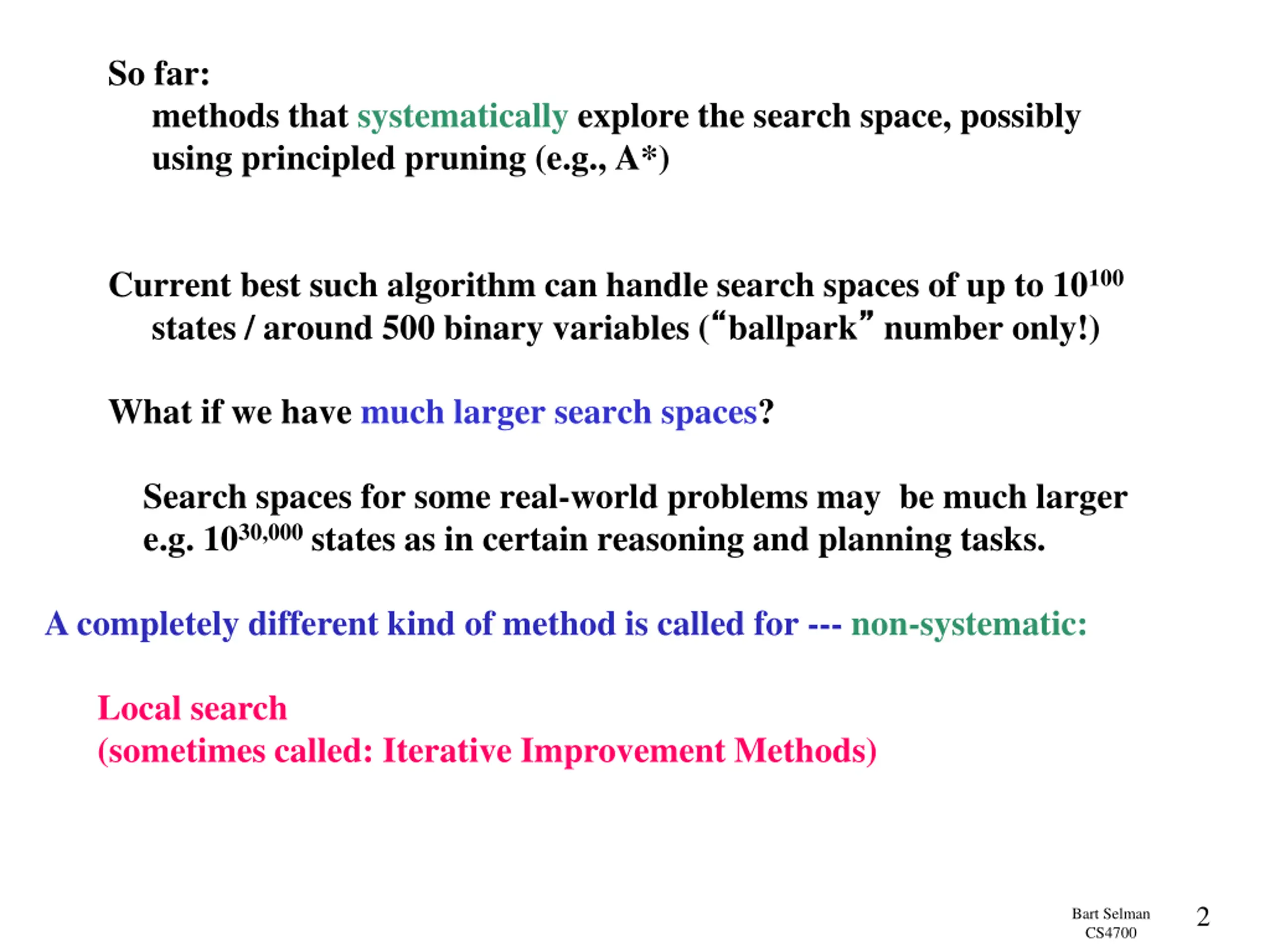 So far: methods that systematically explore the search space, possibly using principled pruning (e.g., A*) Current best such algorithm can handle search spaces of up to 10100 states / around 500 binary variables ( ballpark number only!) What if we have much larger search spaces? Search spaces for some real-world problems may be much larger e.g. 1030,000states as in certain reasoning and planning tasks. A completely different kind of method is called for --- non-systematic: Local search (sometimes called: Iterative Improvement Methods) 2 Bart Selman CS4700