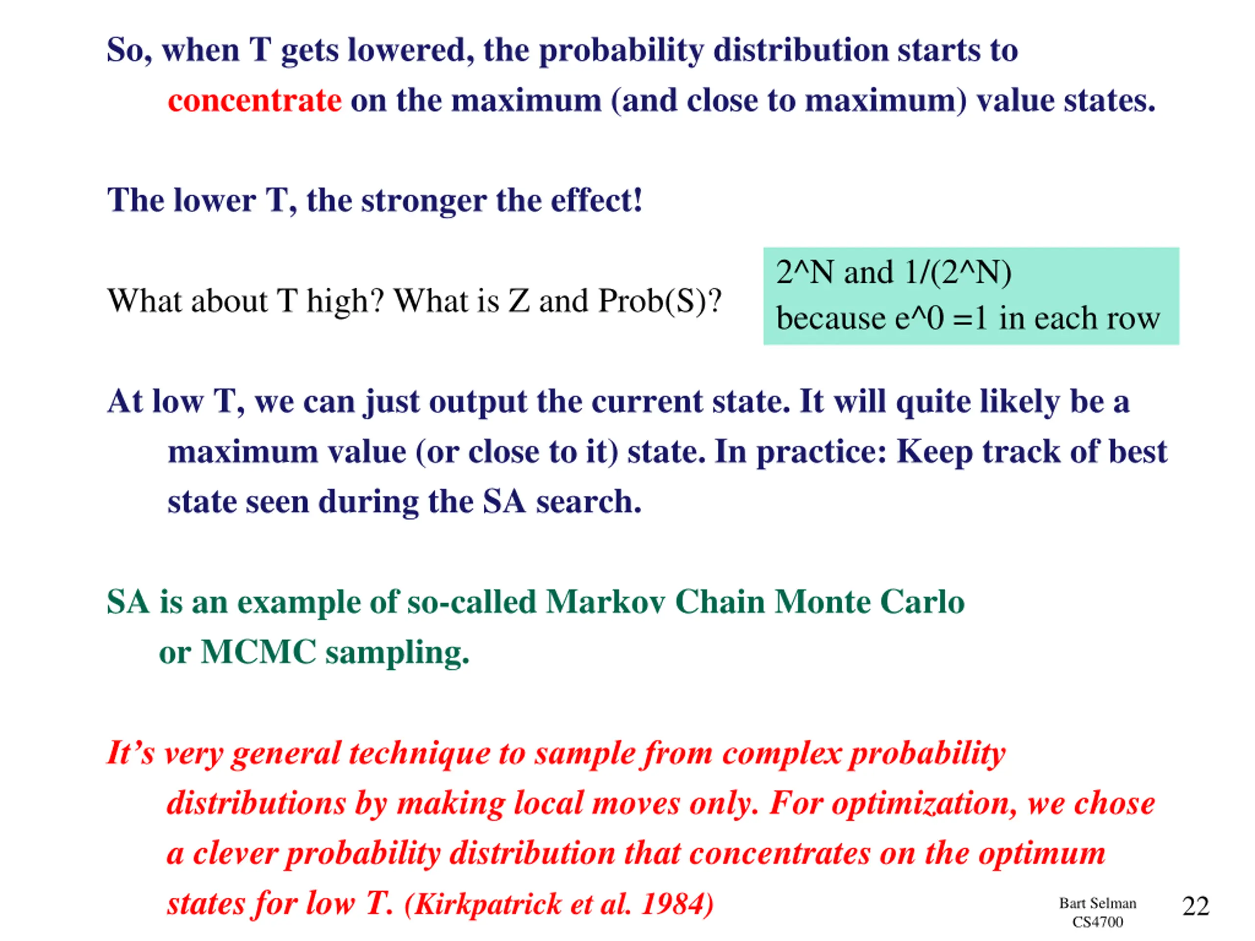 So, when T gets lowered, the probability distribution starts to concentrate on the maximum (and close to maximum) value states. The lower T, the stronger the effect! 2^N and 1/(2^N) because e^0 =1 in each row What about T high? What is Z and Prob(S)? At low T, we can just output the current state. It will quite likely be a maximum value (or close to it) state. In practice: Keep track of best state seen during the SA search. SA is an example of so-called Markov Chain Monte Carlo or MCMC sampling. It s very general technique to sample from complex probability distributions by making local moves only. For optimization, we chose a clever probability distribution that concentrates on the optimum states for low T. (Kirkpatrick et al. 1984) 22 Bart Selman CS4700