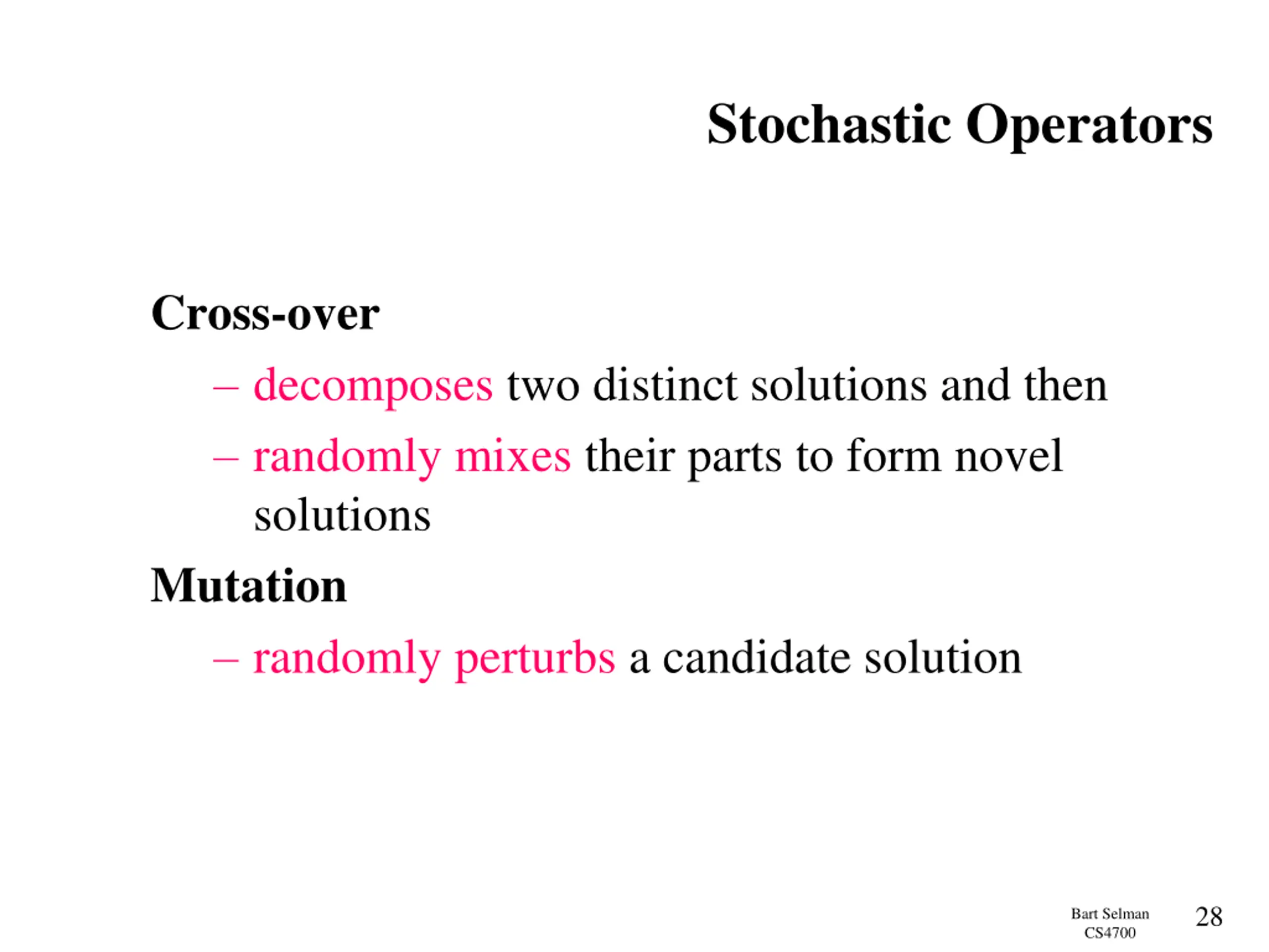 Stochastic Operators Cross-over decomposes two distinct solutions and then randomly mixes their parts to form novel solutions Mutation randomly perturbs a candidate solution 28 Bart Selman CS4700