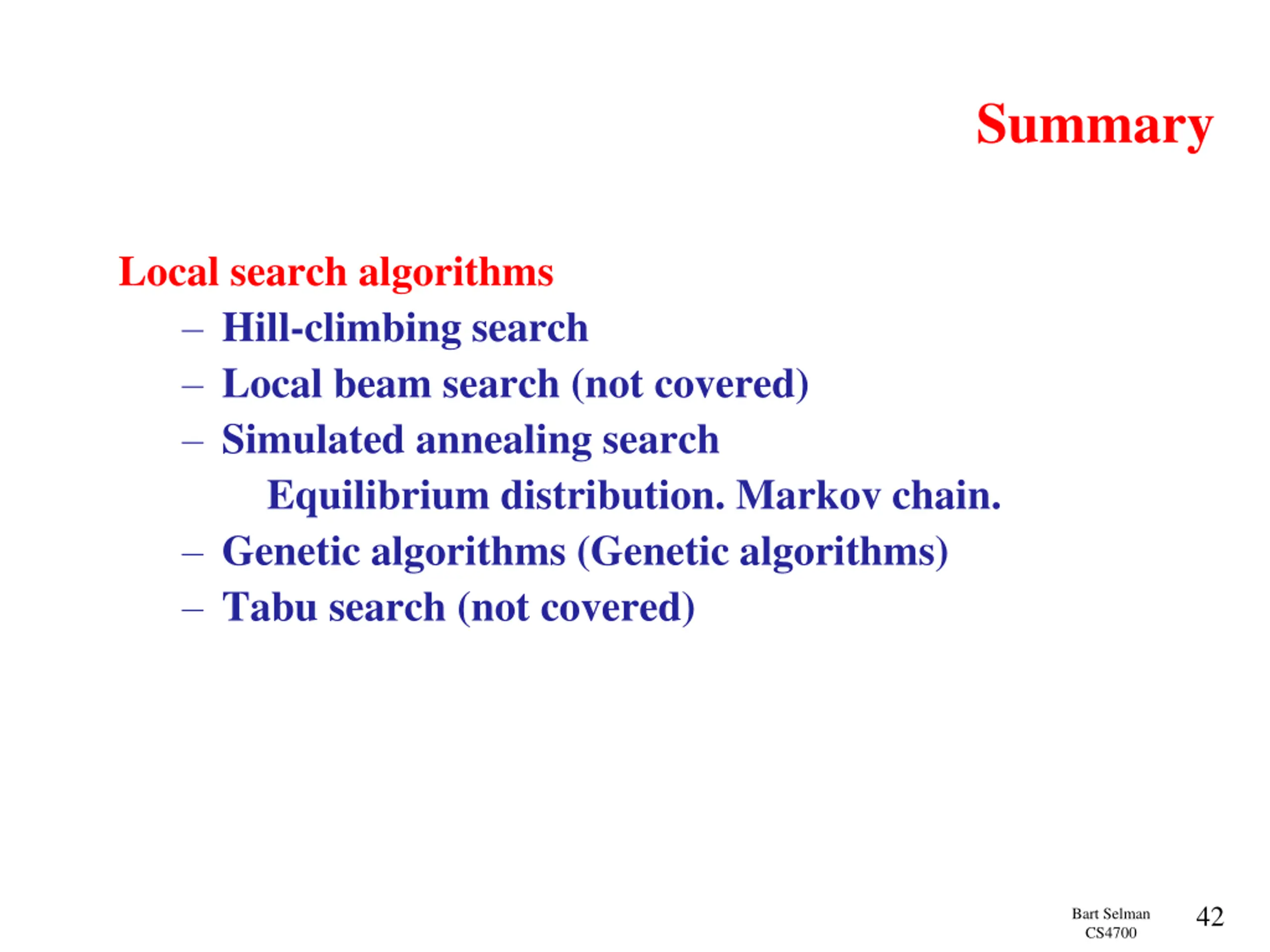 Summary Local search algorithms Hill-climbing search Local beam search (not covered) Simulated annealing search Equilibrium distribution. Markov chain. Genetic algorithms (Genetic algorithms) Tabu search (not covered) 42 Bart Selman CS4700
