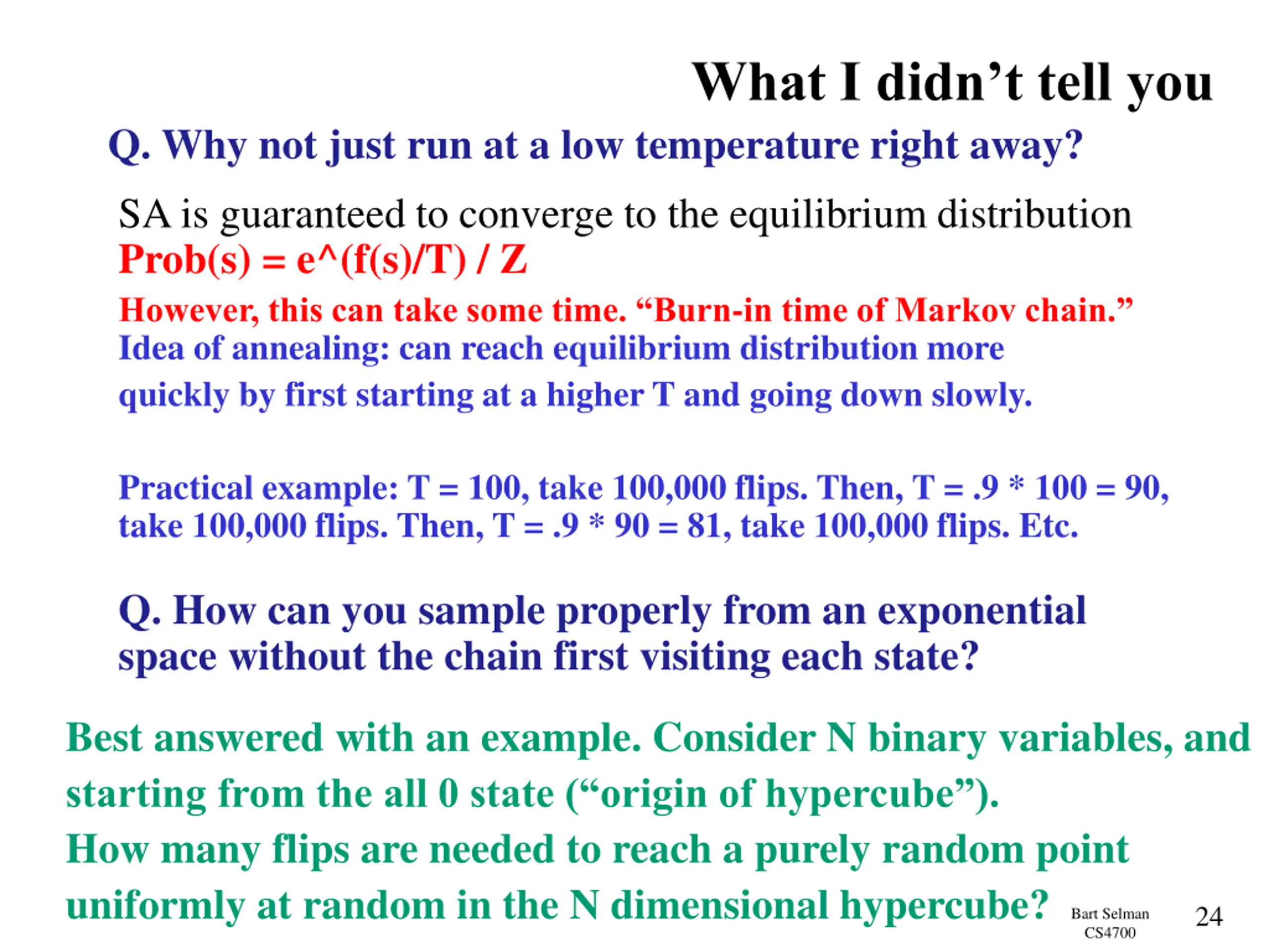 What I didnt tell you Q. Why not just run at a low temperature right away? SA is guaranteed to converge to the equilibrium distribution Prob(s) = e^(f(s)/T) / Z However, this can take some time. Burn-in time of Markov chain. Idea of annealing: can reach equilibrium distribution more quickly by first starting at a higher T and going down slowly. Practical example: T = 100, take 100,000 flips. Then, T = .9 * 100 = 90, take 100,000 flips. Then, T = .9 * 90 = 81, take 100,000 flips. Etc. Q. How can you sample properly from an exponential space without the chain first visiting each state? Best answered with an example. Consider N binary variables, and starting from the all 0 state ( origin of hypercube ). How many flips are needed to reach a purely random point uniformly at random in the N dimensional hypercube? 24 Bart Selman CS4700