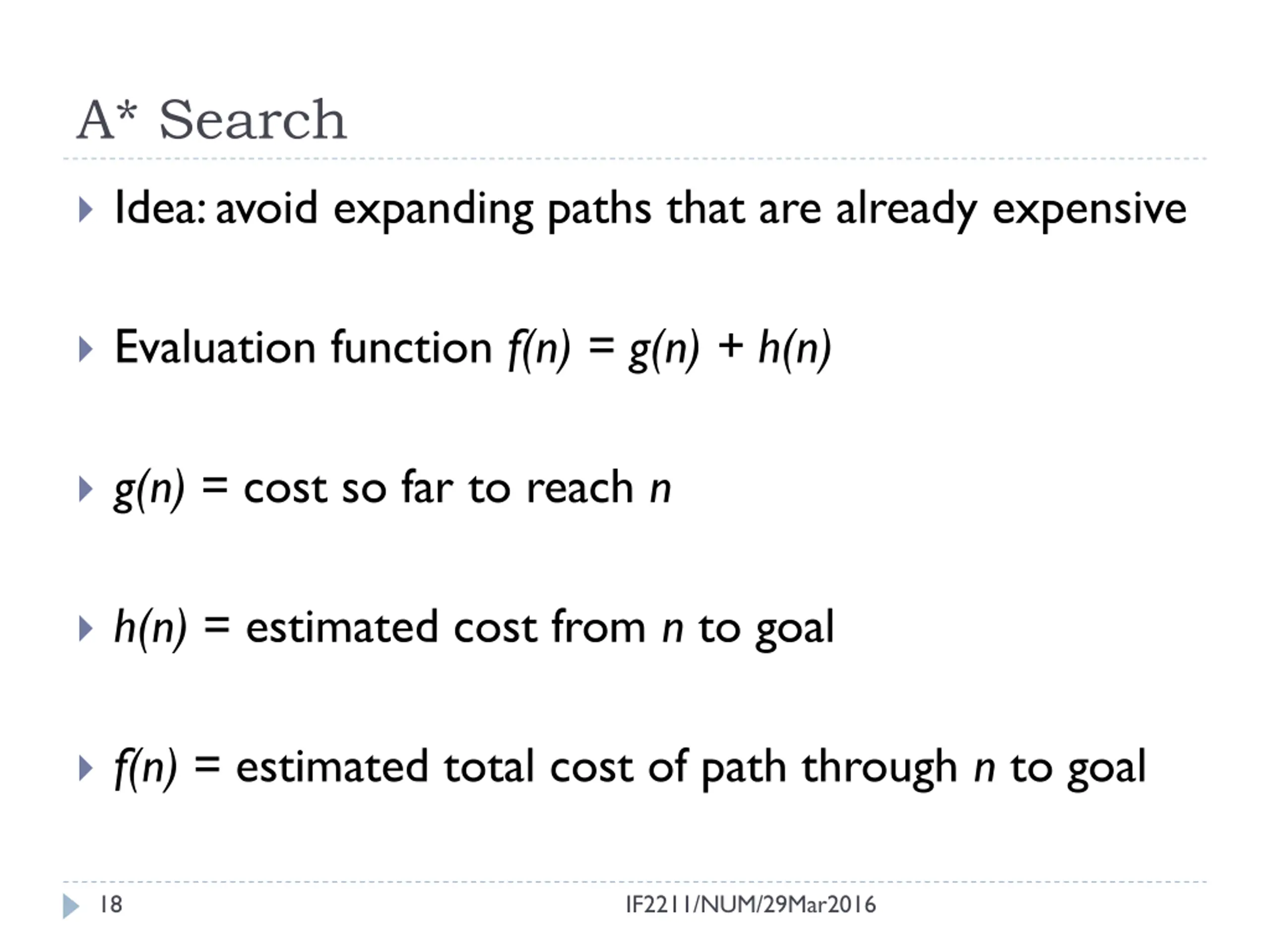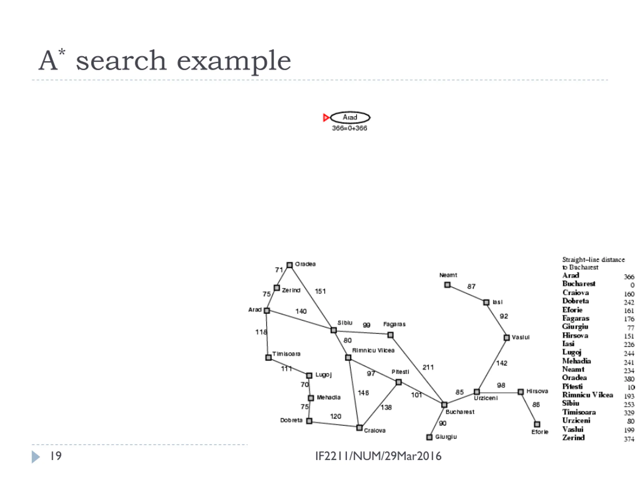 A* Search Idea: avoid expanding paths that are already expensive Evaluation function f(n) = g(n) + h(n) g(n) = cost so far to reach n h(n) = estimated cost from n to goal f(n) = estimated total cost of path through n to goal 18 IF2211/NUM/29Mar2016