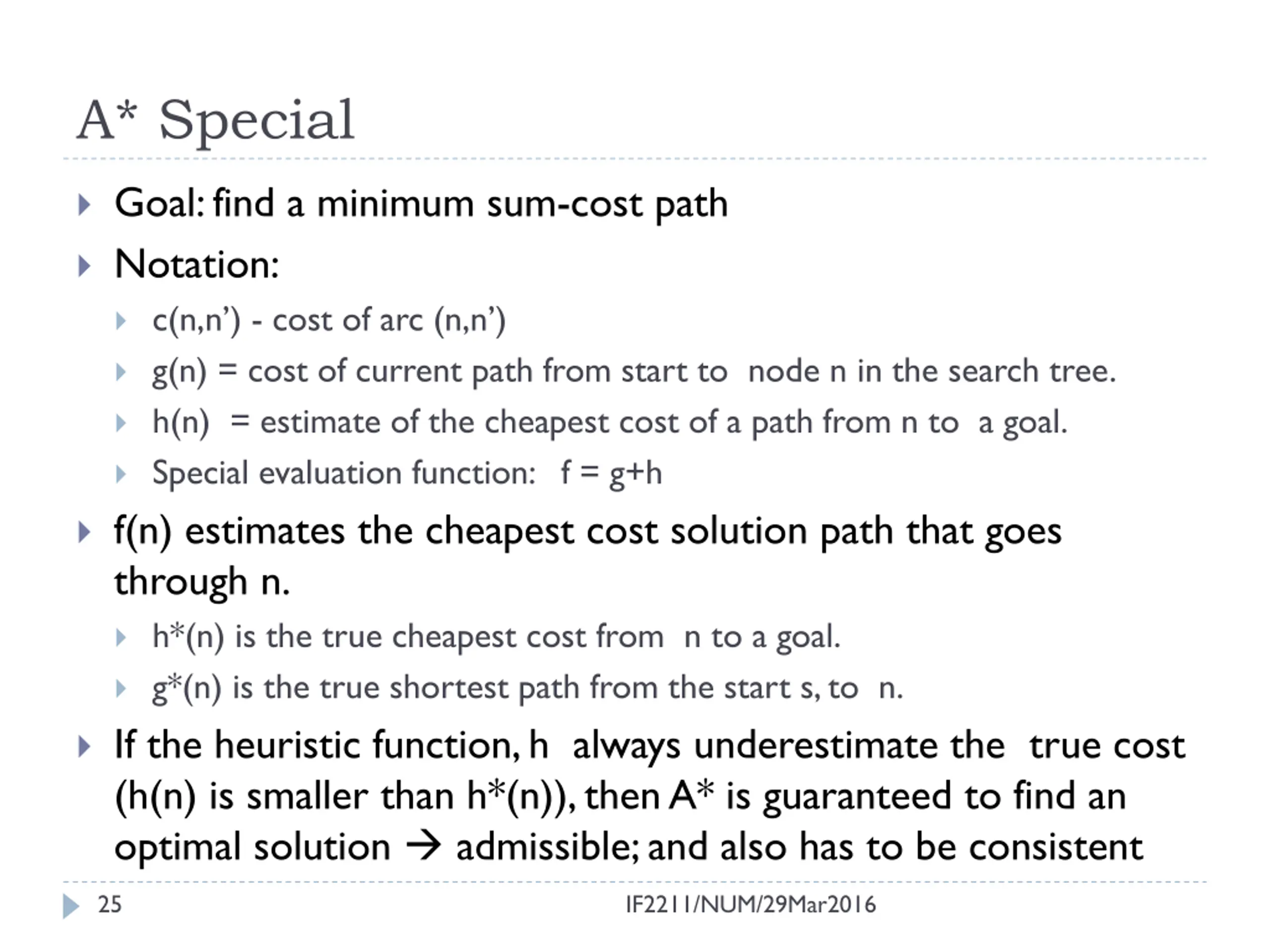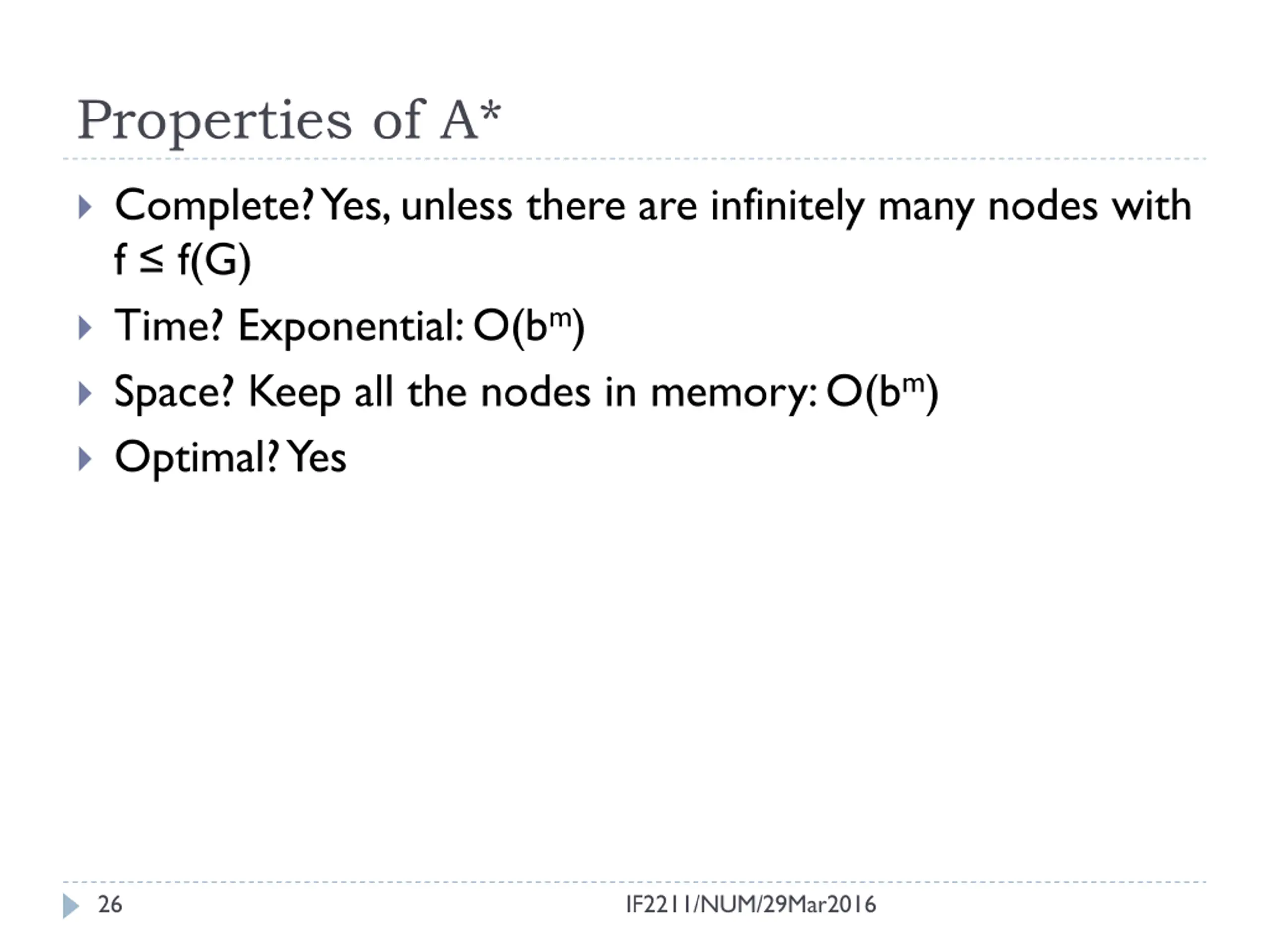 A* Special Goal: find a minimum sum-cost path Notation: c(n,n ) - cost of arc (n,n ) g(n) = cost of current path from start to node n in the search tree. h(n) = estimate of the cheapest cost of a path from n to a goal. Special evaluation function: f = g+h f(n) estimates the cheapest cost solution path that goes through n. h*(n) is the true cheapest cost from n to a goal. g*(n) is the true shortest path from the start s, to n. If the heuristic function, h always underestimate the true cost (h(n) is smaller than h*(n)), then A* is guaranteed to find an optimal solution admissible; and also has to be consistent 25 IF2211/NUM/29Mar2016