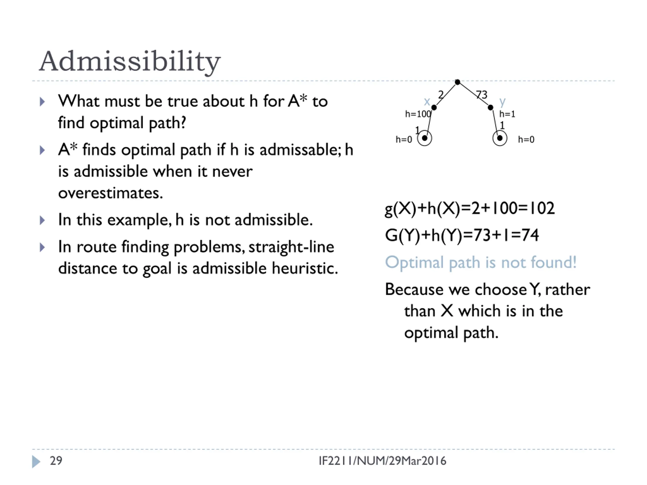 Admissibility 2 73 What must be true about h for A* to find optimal path? A* finds optimal path if h is admissable; h is admissible when it never overestimates. In this example, h is not admissible. In route finding problems, straight-line distance to goal is admissible heuristic. x y h=1 h=100 1 1 h=0 h=0 g(X)+h(X)=2+100=102 G(Y)+h(Y)=73+1=74 Optimal path is not found! Because we choose Y, rather than X which is in the optimal path. 29 IF2211/NUM/29Mar2016