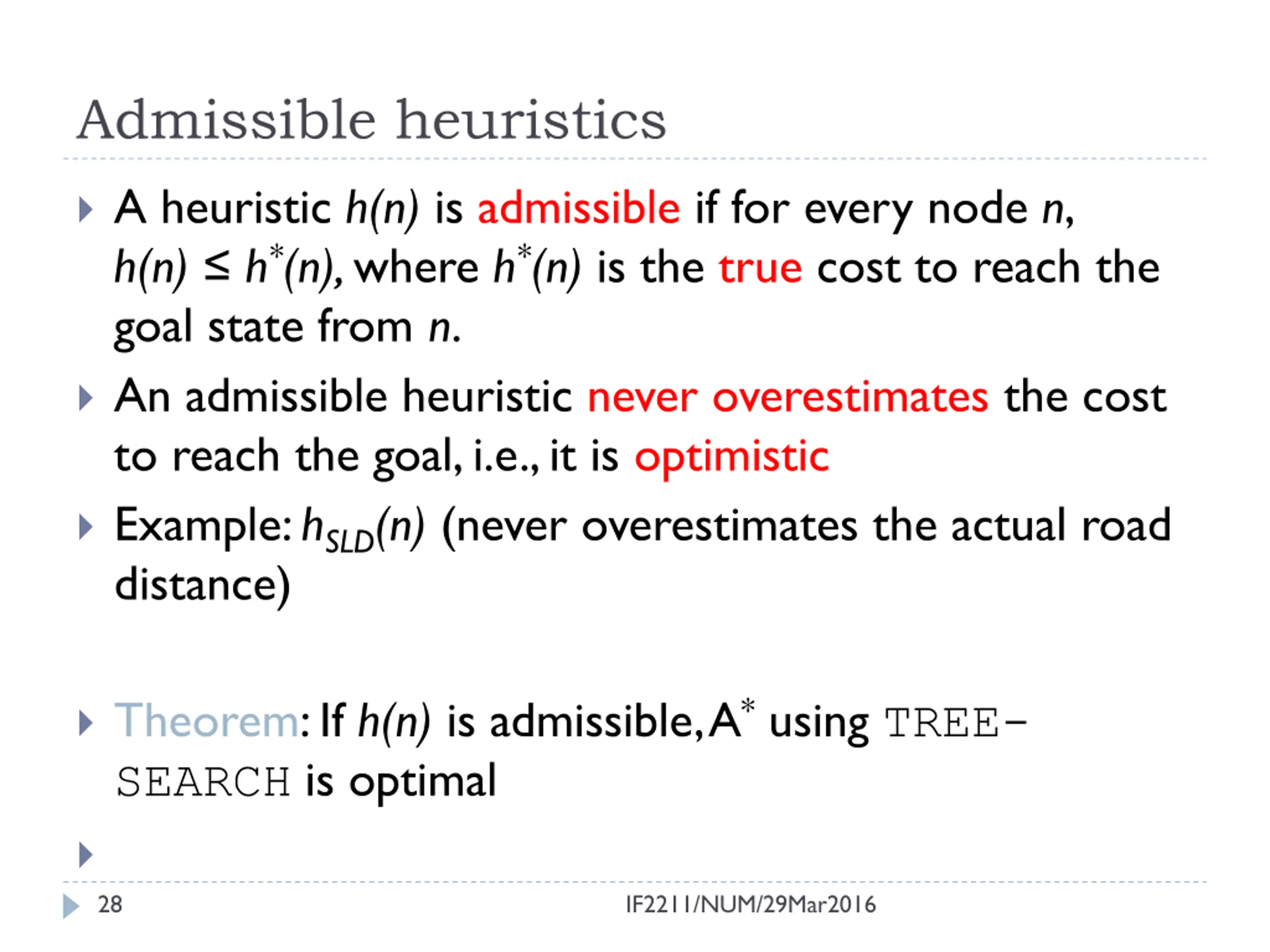 Admissible heuristics A heuristic h(n) is admissible if for every node n, h(n) h*(n), where h*(n) is the true cost to reach the goal state from n. An admissible heuristic never overestimates the cost to reach the goal, i.e., it is optimistic Example: hSLD(n) (never overestimates the actual road distance) Theorem: If h(n) is admissible, A* using TREE- SEARCH is optimal 28 IF2211/NUM/29Mar2016