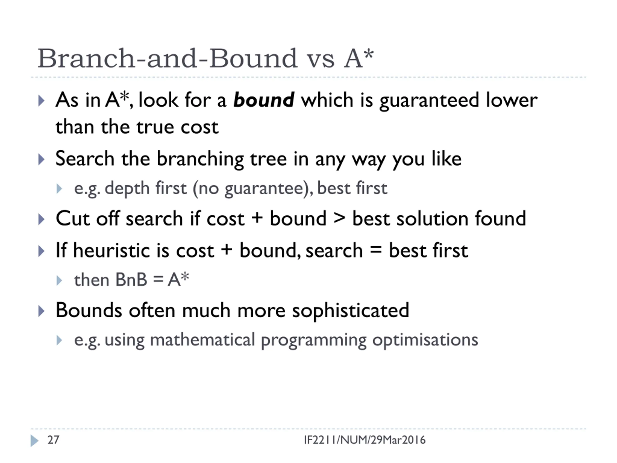 Branch-and-Bound vs A* As in A*, look for a bound which is guaranteed lower than the true cost Search the branching tree in any way you like e.g. depth first (no guarantee), best first Cut off search if cost + bound > best solution found If heuristic is cost + bound, search = best first then BnB = A* Bounds often much more sophisticated e.g. using mathematical programming optimisations 27 IF2211/NUM/29Mar2016