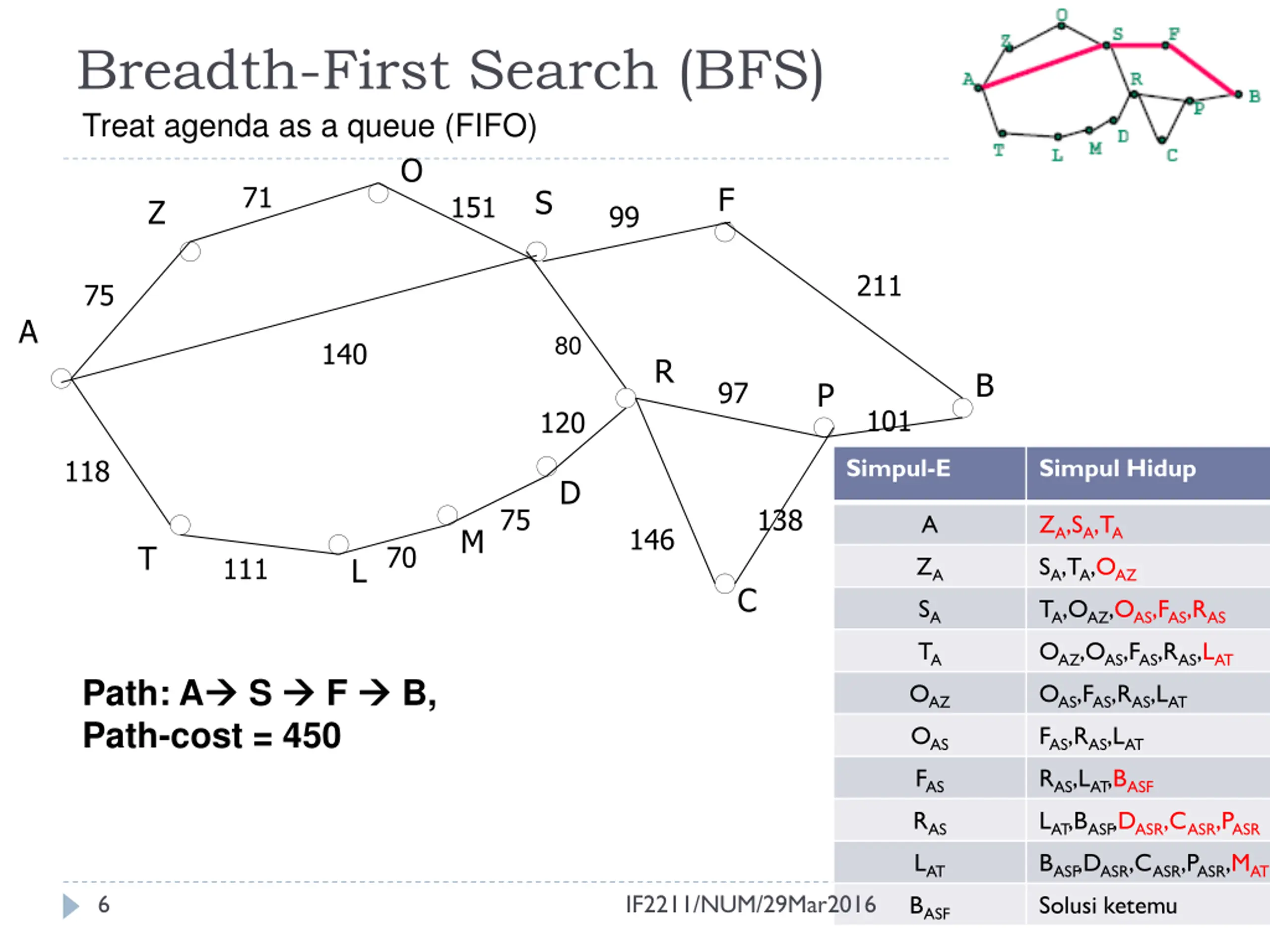 Breadth-First Search (BFS) Treat agenda as a queue (FIFO) O F 71 S 151 Z 99 211 75 A 80 140 R B P 97 101 120 118 Simpul-E Simpul Hidup D 75 138 A ZA,SA,TA SA,TA,OAZ TA,OAZ,OAS,FAS,RAS OAZ,OAS,FAS,RAS,LAT OAS,FAS,RAS,LAT FAS,RAS,LAT RAS,LAT,BASF LAT,BASF,DASR,CASR,PASR BASF,DASR,CASR,PASR,MATL Solusi ketemu M 146 T 70 L 111 ZA SA TA OAZ OAS FAS RAS LAT BASF C Path: A Path-cost = 450 S F B, 6 IF2211/NUM/29Mar2016