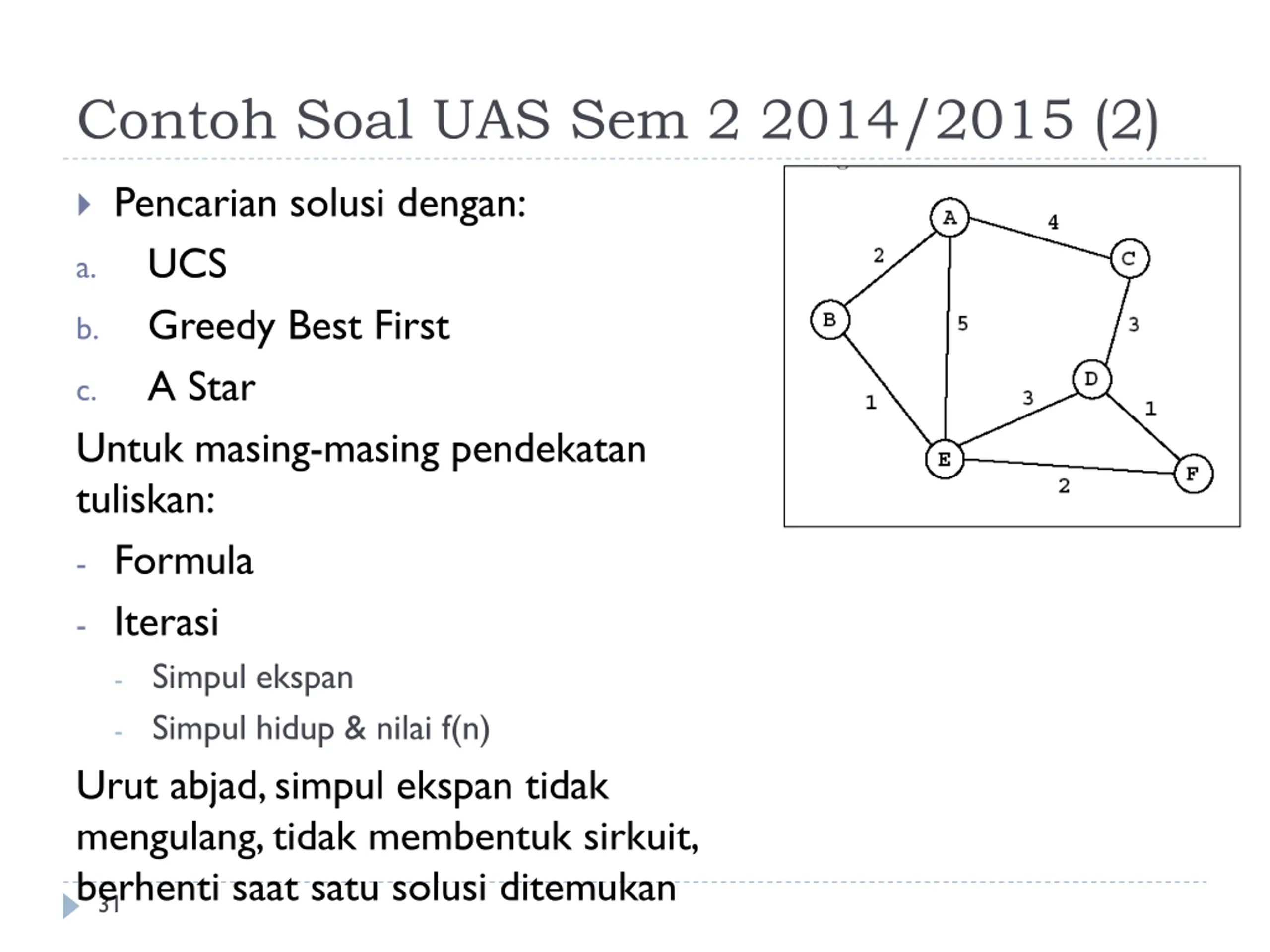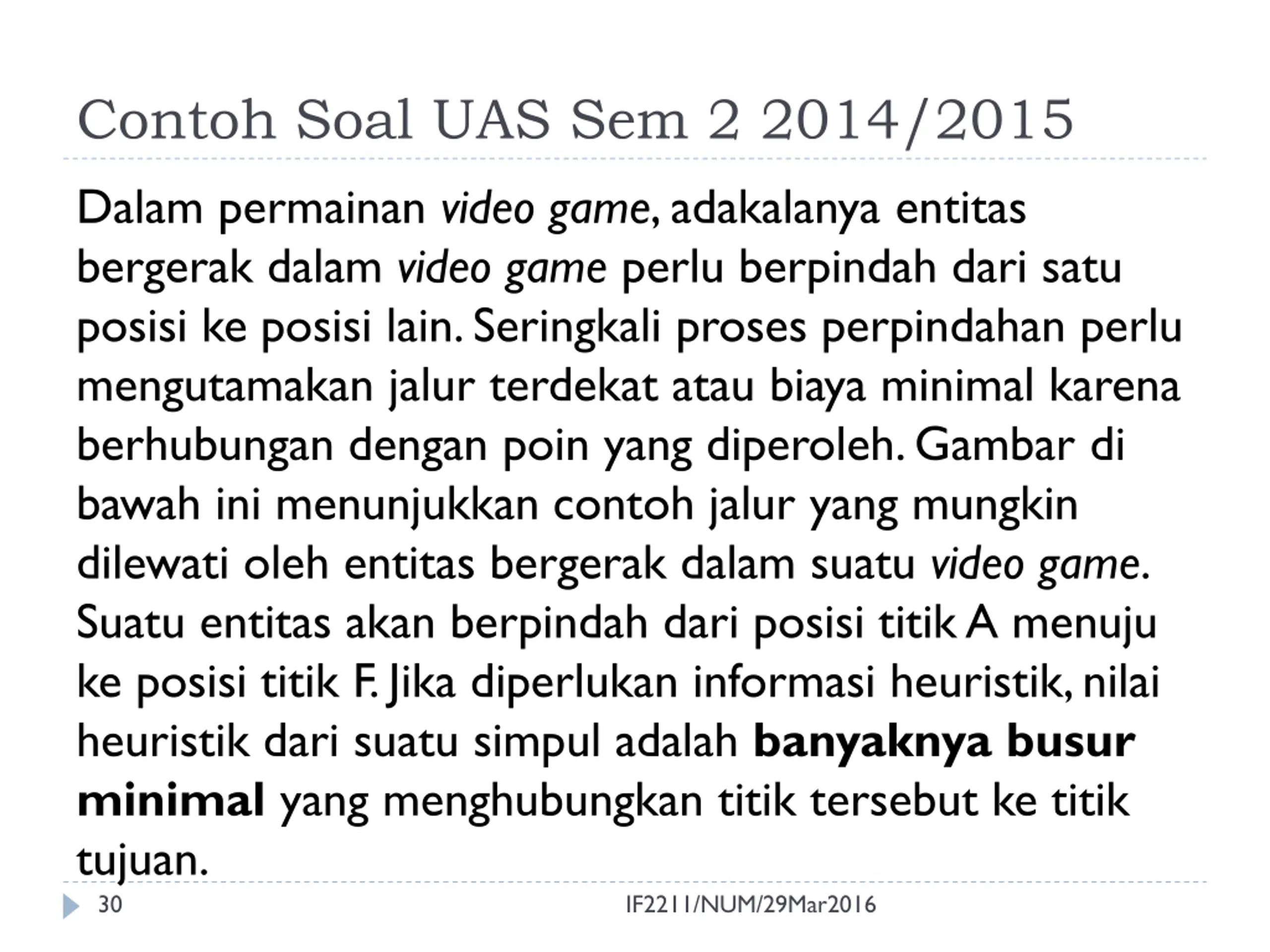 Contoh Soal UAS Sem 2 2014/2015 Dalam permainan video game, adakalanya entitas bergerak dalam video game perlu berpindah dari satu posisi ke posisi lain. Seringkali proses perpindahan perlu mengutamakan jalur terdekat atau biaya minimal karena berhubungan dengan poin yang diperoleh. Gambar di bawah ini menunjukkan contoh jalur yang mungkin dilewati oleh entitas bergerak dalam suatu video game. Suatu entitas akan berpindah dari posisi titik A menuju ke posisi titik F. Jika diperlukan informasi heuristik, nilai heuristik dari suatu simpul adalah banyaknya busur minimal yang menghubungkan titik tersebut ke titik tujuan. IF2211/NUM/29Mar2016 30