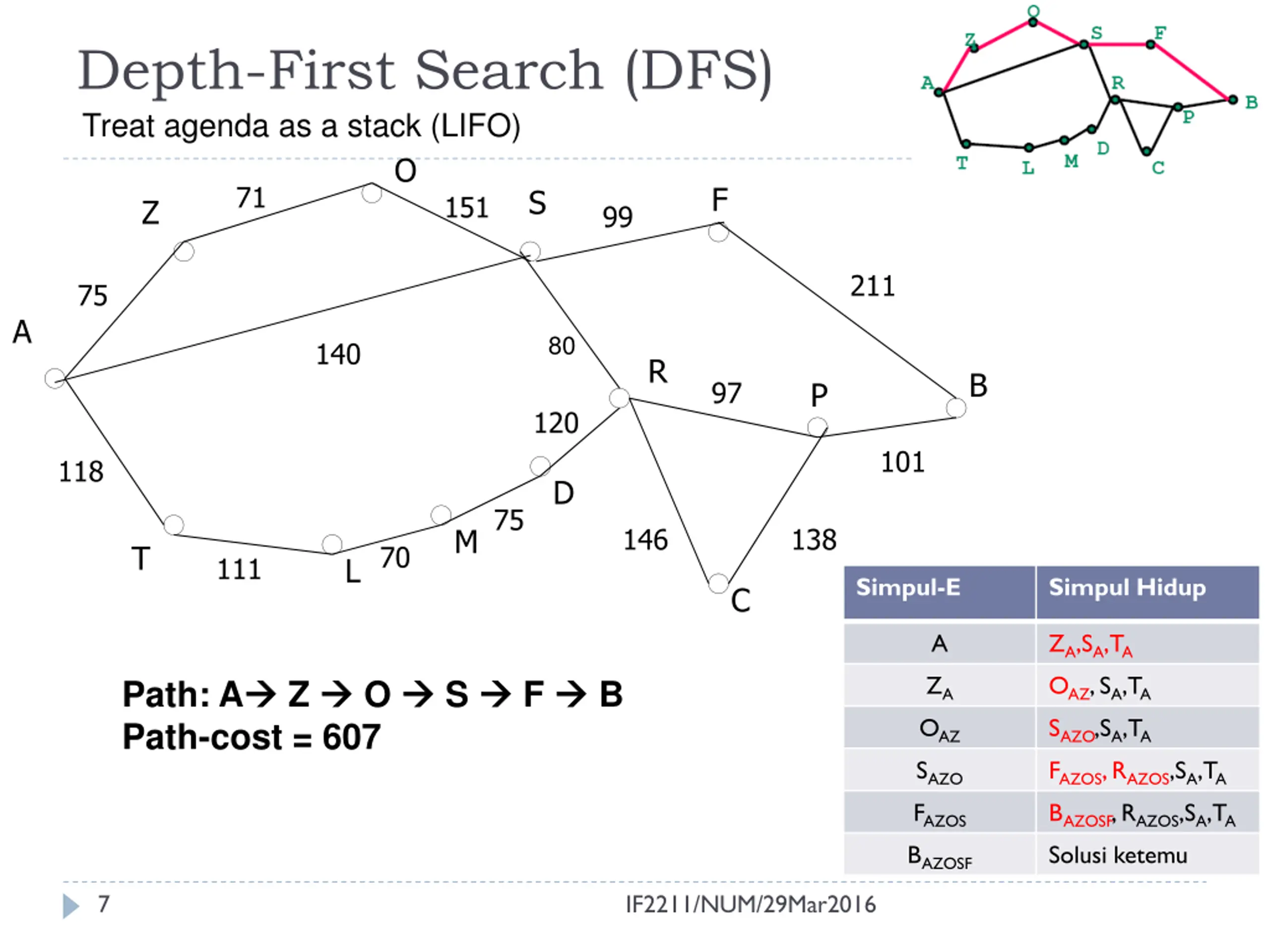 Depth-First Search (DFS) Treat agenda as a stack (LIFO) O F 71 S 151 Z 99 211 75 A 80 140 R B P 97 120 101 118 D 75 M 146 138 T 70 L 111 Simpul-E Simpul Hidup C A ZA,SA,TA OAZ, SA,TA SAZO,SA,TA FAZOS, RAZOS,SA,TA BAZOSF, RAZOS,SA,TA Solusi ketemu ZA OAZ SAZO FAZOS BAZOSF Path: A Path-cost = 607 Z O S F B 7 IF2211/NUM/29Mar2016