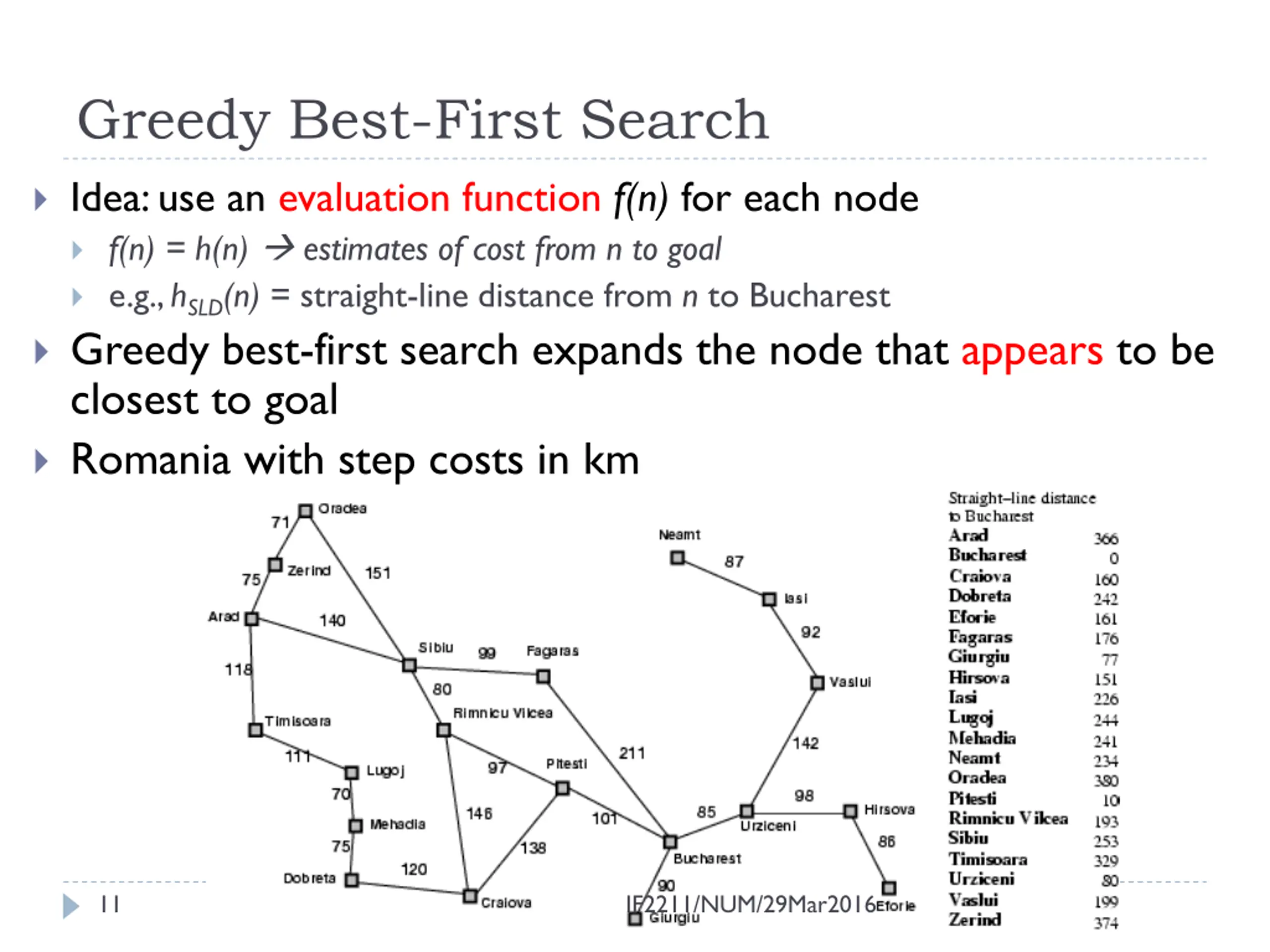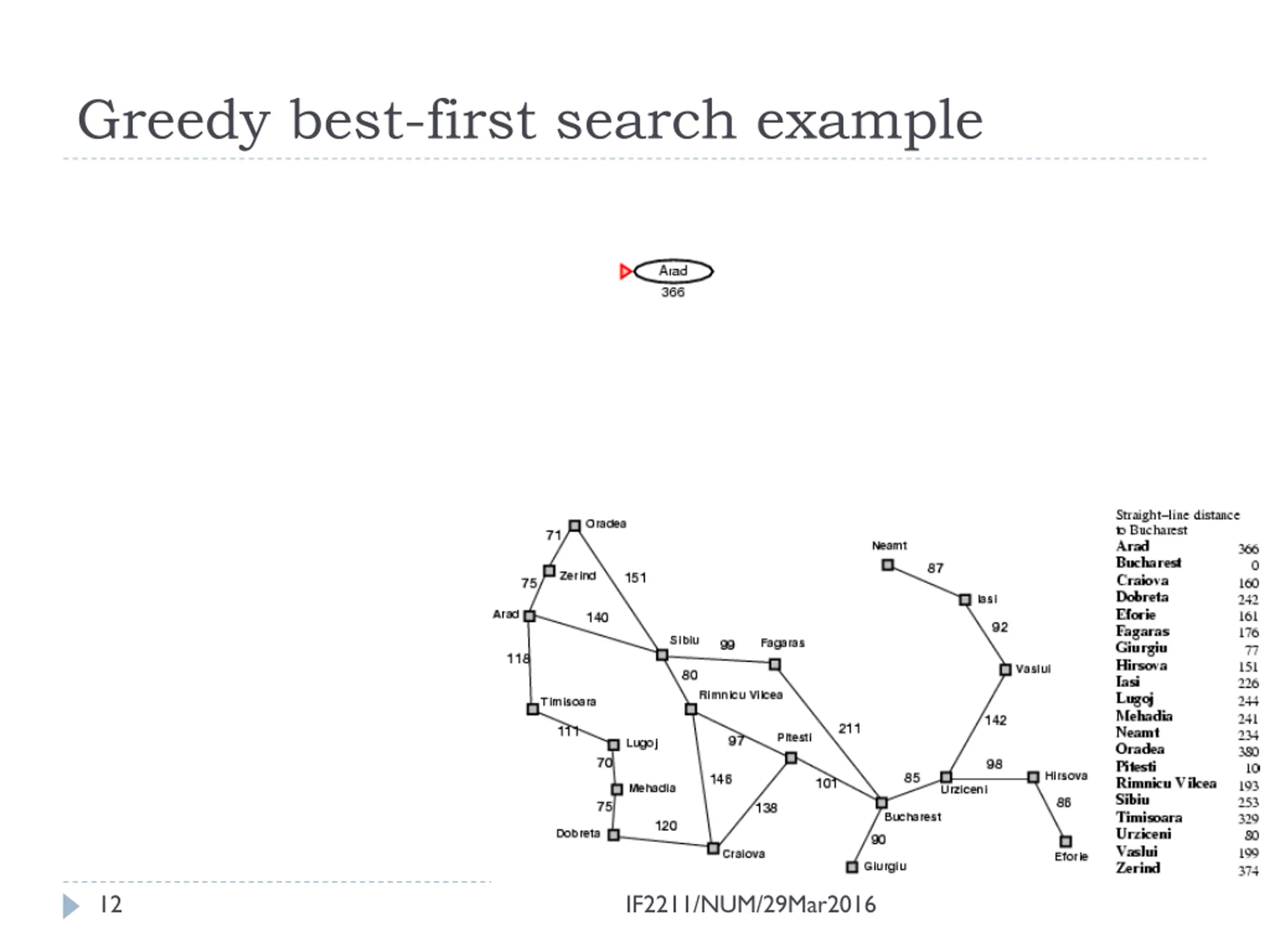 Greedy Best-First Search Idea: use an evaluation function f(n) for each node f(n) = h(n) estimates of cost from n to goal e.g., hSLD(n) = straight-line distance from n to Bucharest Greedy best-first search expands the node that appears to be closest to goal Romania with step costs in km 11 IF2211/NUM/29Mar2016