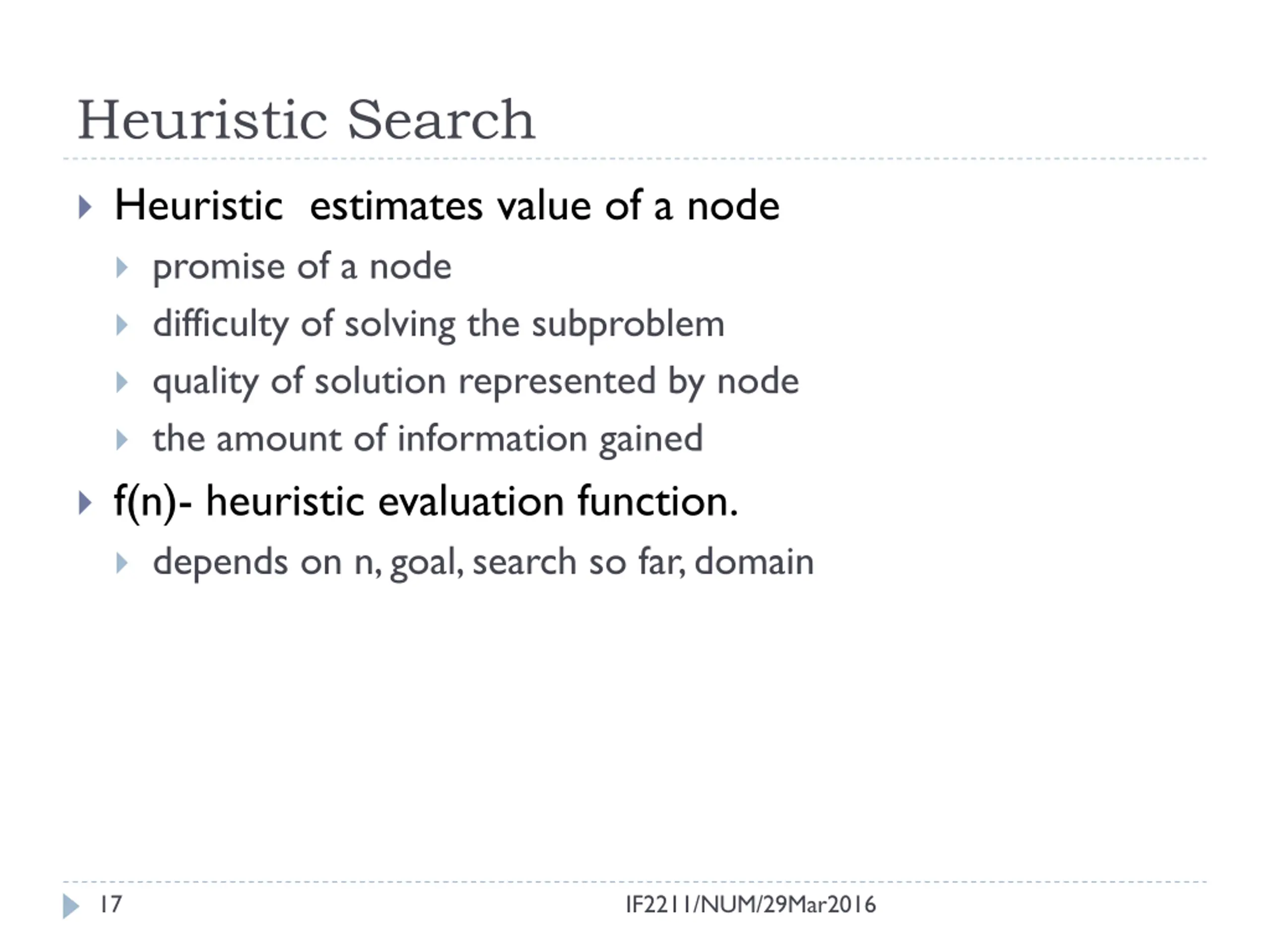 Heuristic Search Heuristic estimates value of a node promise of a node difficulty of solving the subproblem quality of solution represented by node the amount of information gained f(n)- heuristic evaluation function. depends on n, goal, search so far, domain 17 IF2211/NUM/29Mar2016