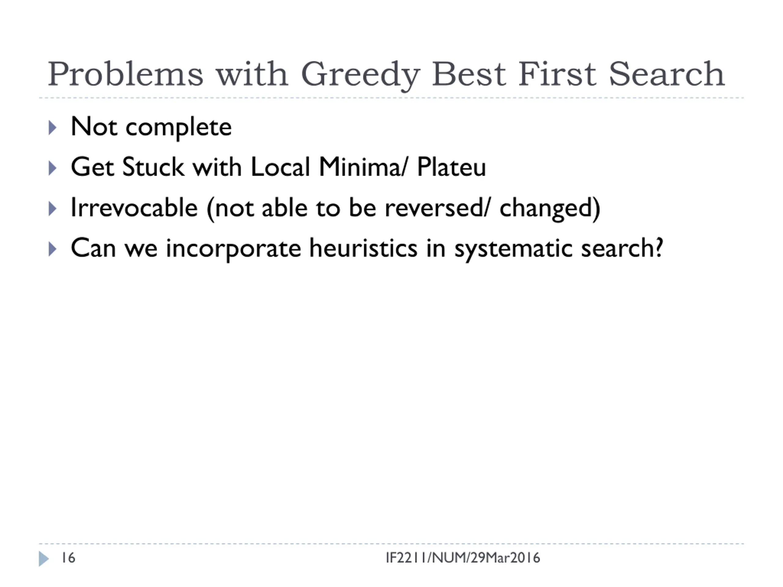 Problems with Greedy Best First Search Not complete Get Stuck with Local Minima/ Plateu Irrevocable (not able to be reversed/ changed) Can we incorporate heuristics in systematic search? 16 IF2211/NUM/29Mar2016