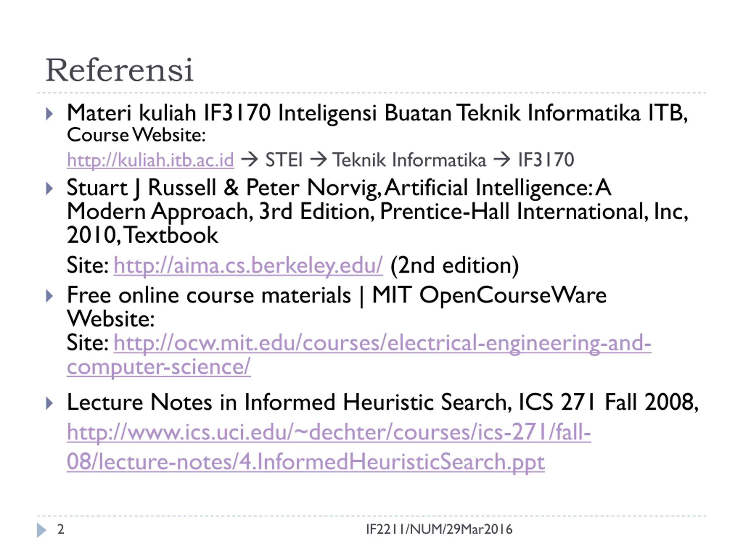 Referensi Materi kuliah IF3170 Inteligensi Buatan Teknik Informatika ITB, Course Website: http://kuliah.itb.ac.id STEI Teknik Informatika IF3170 Stuart J Russell & Peter Norvig, Artificial Intelligence: A Modern Approach, 3rd Edition, Prentice-Hall International, Inc, 2010, Textbook Site: http://aima.cs.berkeley.edu/ (2nd edition) Free online course materials | MIT OpenCourseWare Website: Site: http://ocw.mit.edu/courses/electrical-engineering-and- computer-science/ Lecture Notes in Informed Heuristic Search, ICS 271 Fall 2008, http://www.ics.uci.edu/~dechter/courses/ics-271/fall- 08/lecture-notes/4.InformedHeuristicSearch.ppt 2 IF2211/NUM/29Mar2016