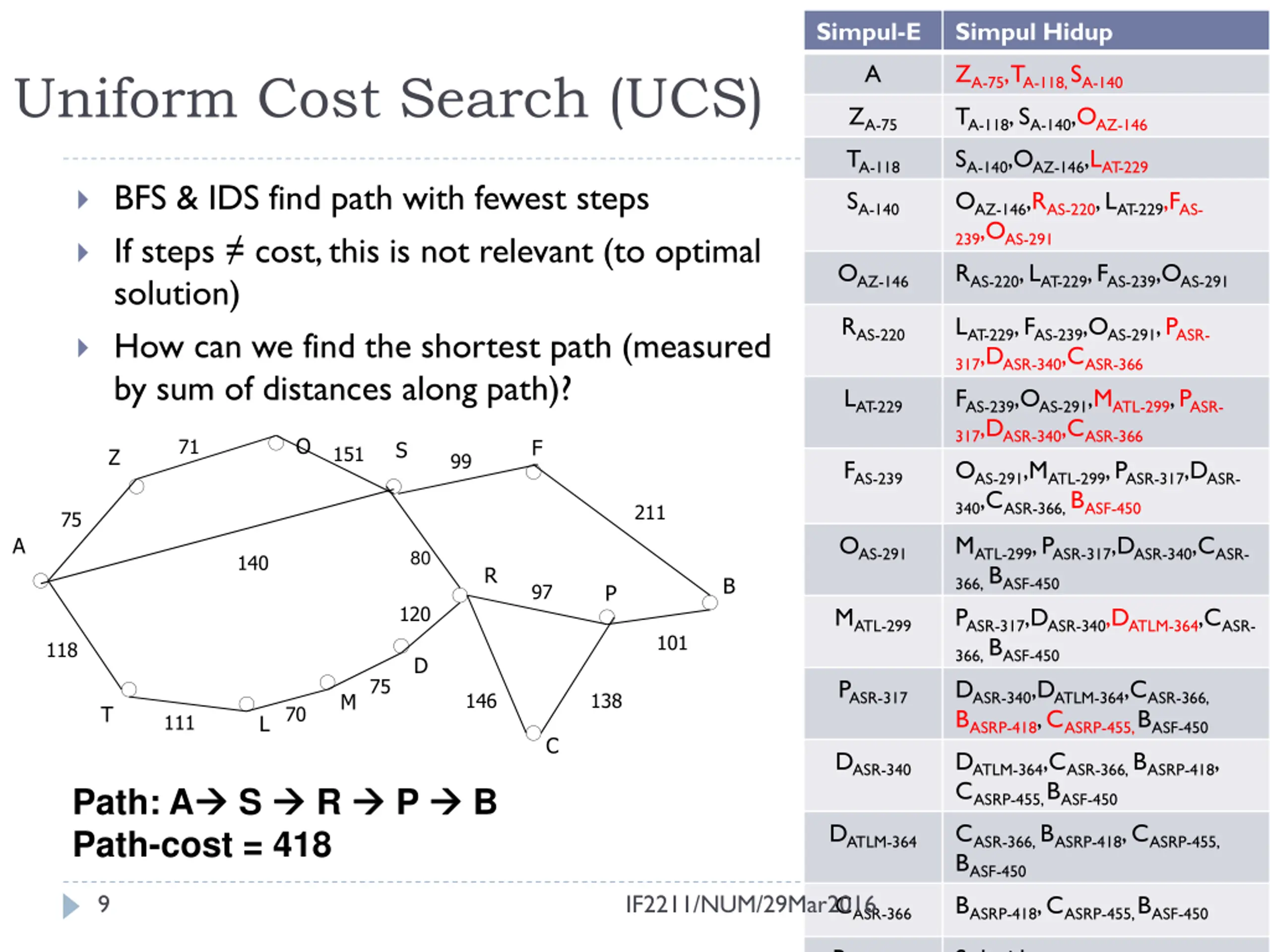 Simpul-E Simpul Hidup A ZA-75, TA-118, SA-140 TA-118, SA-140,OAZ-146 SA-140,OAZ-146,LAT-229 OAZ-146,RAS-220,LAT-229,FAS- 239,OAS-291 RAS-220, LAT-229,FAS-239,OAS-291 Uniform Cost Search (UCS) ZA-75 TA-118 SA-140 BFS & IDS find path with fewest steps If steps cost, this is not relevant (to optimal solution) How can we find the shortest path (measured by sum of distances along path)? OAZ-146 RAS-220 LAT-229,FAS-239,OAS-291, PASR- 317,DASR-340,CASR-366 FAS-239,OAS-291,MATL-299, PASR- 317,DASR-340,CASR-366 OAS-291,MATL-299,PASR-317,DASR- 340,CASR-366,BASF-450 LAT-229 O 71 F S 151 Z 99 FAS-239 211 75 OAS-291 MATL-299,PASR-317,DASR-340,CASR- 366,BASF-450 PASR-317,DASR-340,DATLM-364,CASR- 366,BASF-450 DASR-340,DATLM-364,CASR-366, BASRP-418,CASRP-455, BASF-450 DATLM-364,CASR-366,BASRP-418, CASRP-455, BASF-450 CASR-366,BASRP-418,CASRP-455, BASF-450 BASRP-418,CASRP-455, BASF-450 A 80 140 R B 97 P 120 MATL-299 101 118 D 75 PASR-317 M 146 138 T 70 111 L C DASR-340 Path: A Path-cost = 418 S R P B DATLM-364 9 IF2211/NUM/29Mar2016 CASR-366 B Solusi ketemu