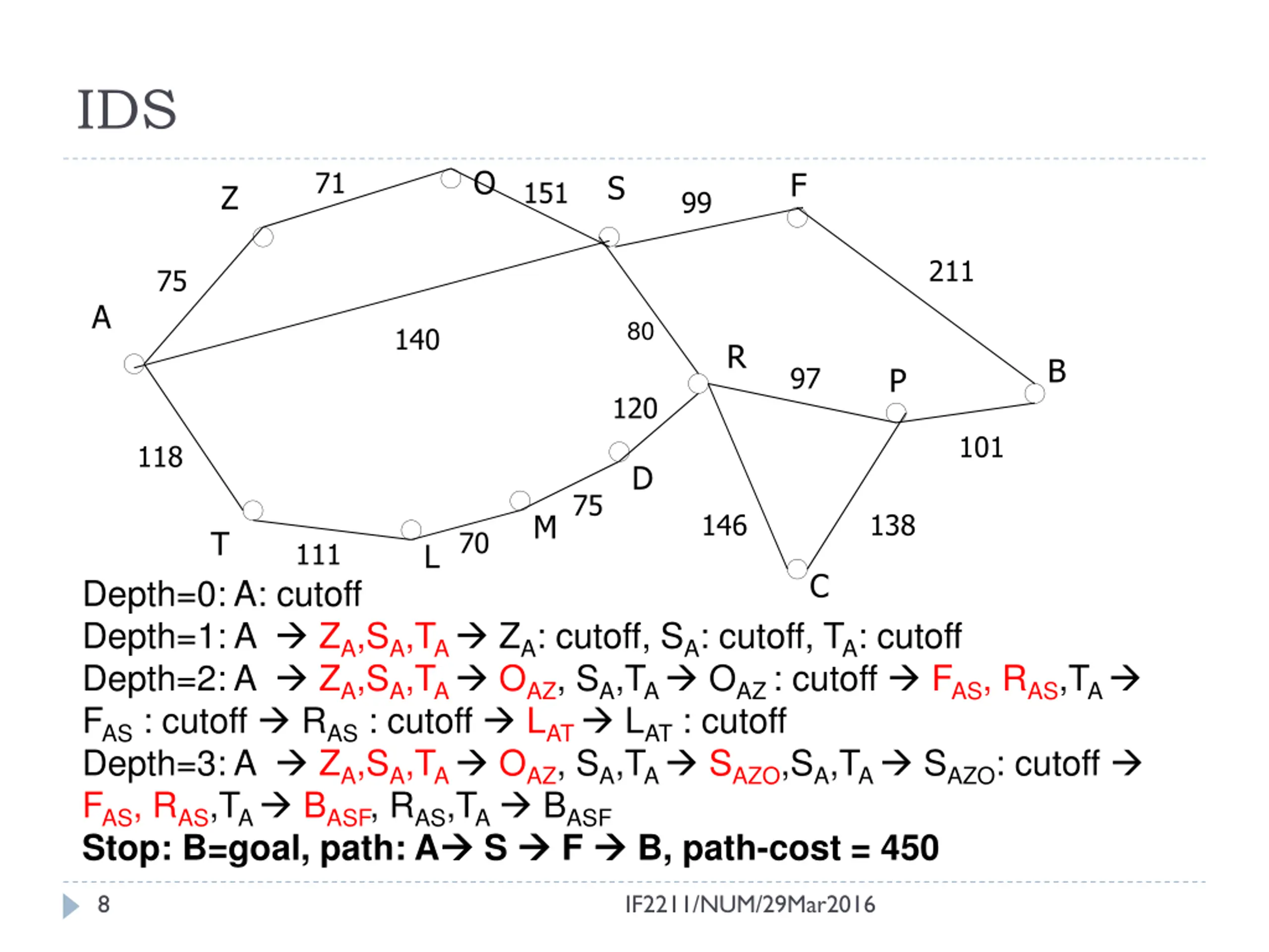 IDS O F 71 S 151 Z 99 211 75 A 80 140 R B P 97 120 101 118 D 75 M 146 138 T 70 L 111 C Depth=0: A: cutoff Depth=1: A ZA,SA,TA ZA: cutoff, SA: cutoff, TA: cutoff Depth=2: A ZA,SA,TA OAZ, SA,TA OAZ : cutoff FAS, RAS,TA FAS : cutoff RAS : cutoff LAT LAT : cutoff Depth=3: A ZA,SA,TA OAZ, SA,TA SAZO,SA,TA SAZO: cutoff FAS, RAS,TA BASF, RAS,TA BASF Stop: B=goal, path: A S F B, path-cost = 450 8 IF2211/NUM/29Mar2016