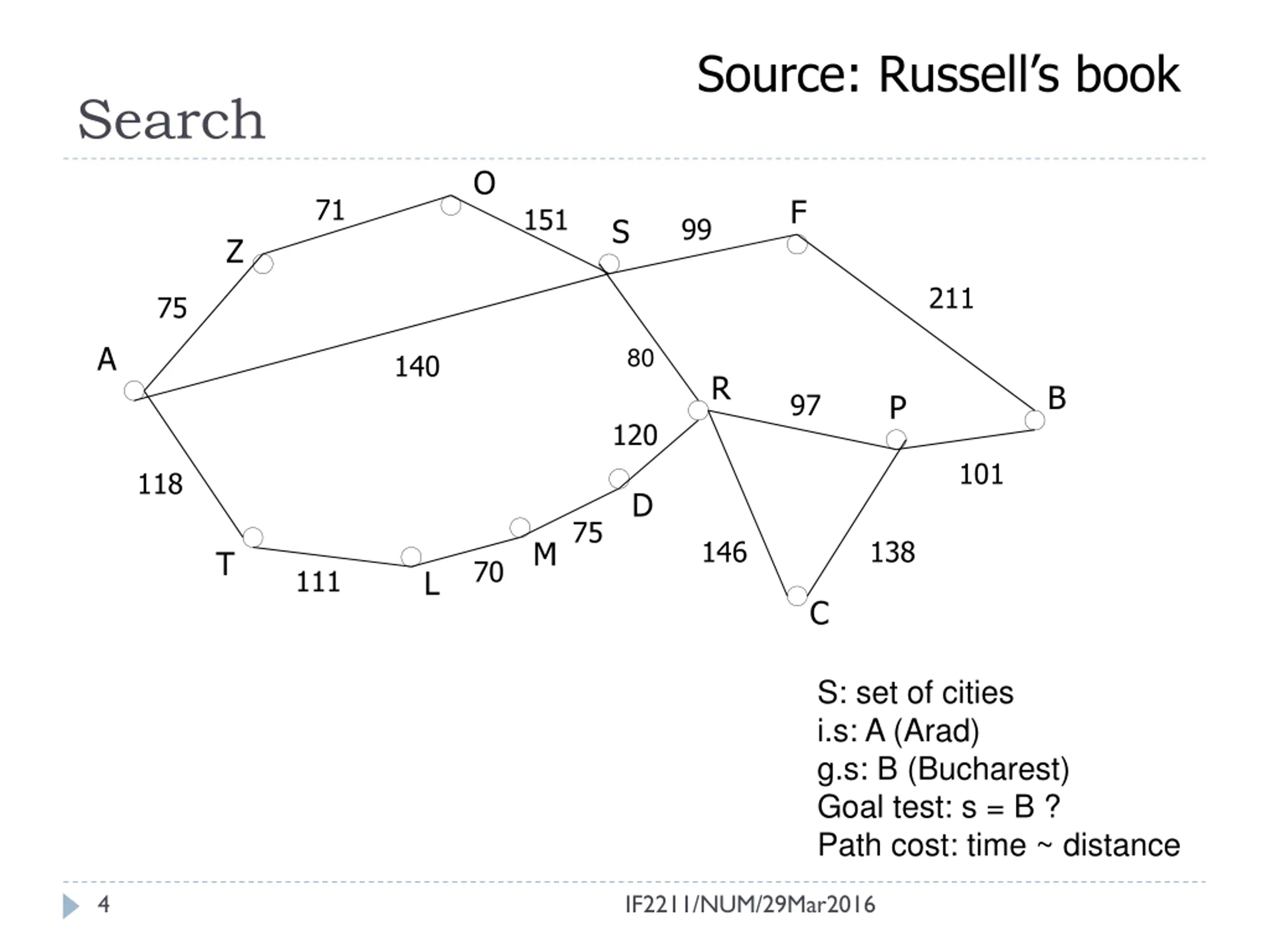 Source: Russells book Search O F 71 151 S 99 Z 211 75 A 80 140 R B P 97 120 101 118 D 75 M 146 138 T 70 L 111 C S: set of cities i.s: A (Arad) g.s: B (Bucharest) Goal test: s = B ? Path cost: time ~ distance 4 IF2211/NUM/29Mar2016
