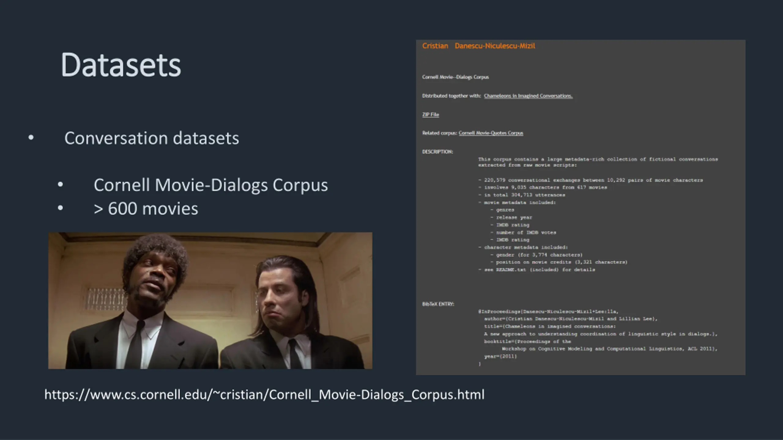 Datasets Datasets Conversation datasets Cornell Movie-Dialogs Corpus > 600 movies https://www.cs.cornell.edu/~cristian/Cornell_Movie-Dialogs_Corpus.html